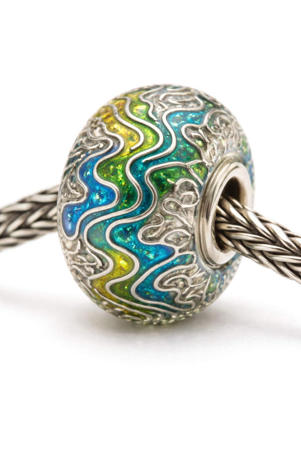 River of Light was designed as a moment of instant uplift. Inspired by flowing rivers, green meadows, and warm sunlight, the bead captures nature’s quiet ability to restore calm and clarity. The continuous lines and luminous colours invite the eye to move gently around the bead, offering a sense of ease, balance, and quiet relief simply by looking at it.