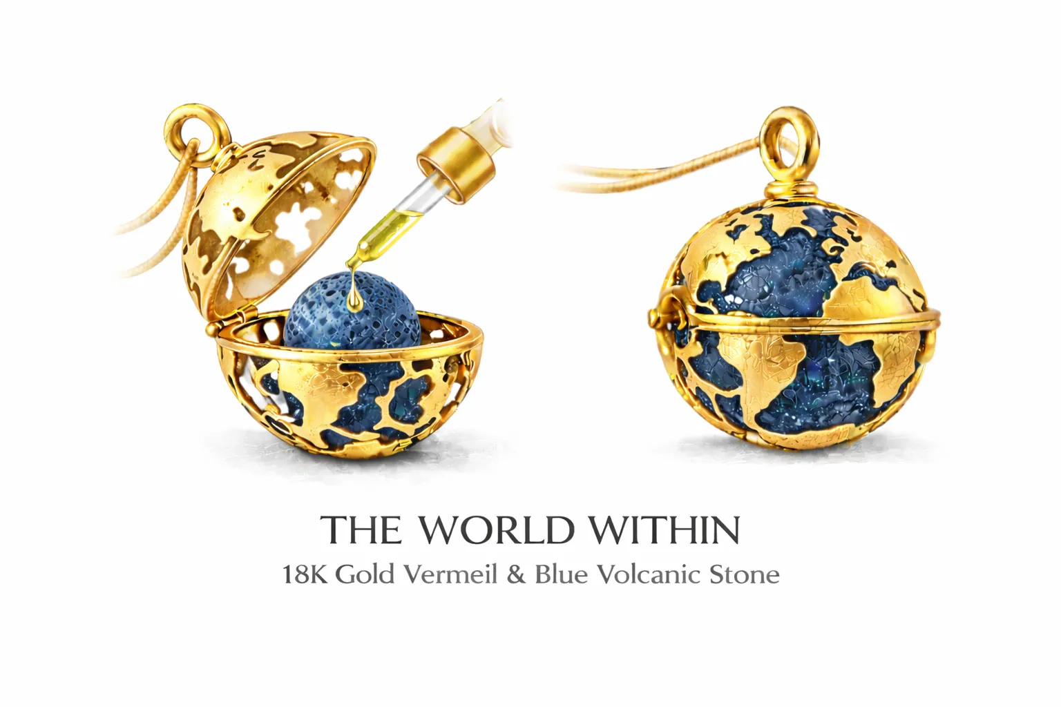 The Inspiration: A Sensory Sanctuary- A hinged 18K Gold Vermeil globe locket with a porous volcanic heart, designed to be worn as an aromatherapy pendant or a transformable bead