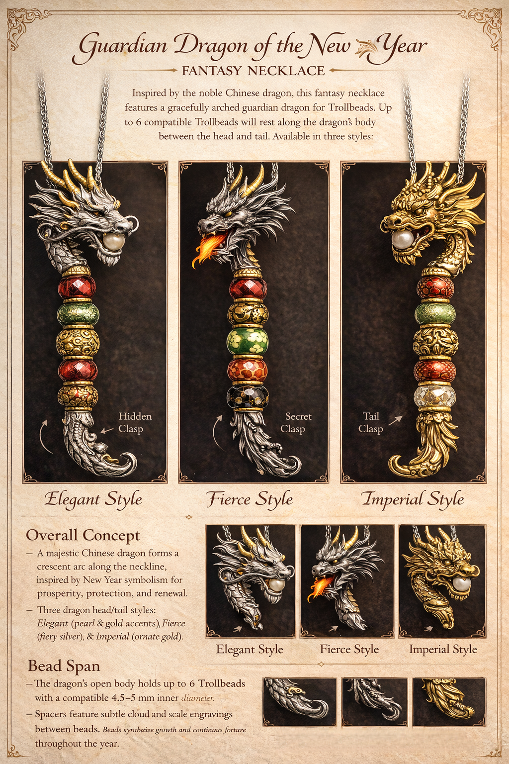 The dragon’s body is open, allowing up to 6 beads to sit between the head and tail, similar in spirit to the Guardian of Love fantasy necklace—but distinctly Eastern in form and meaning.