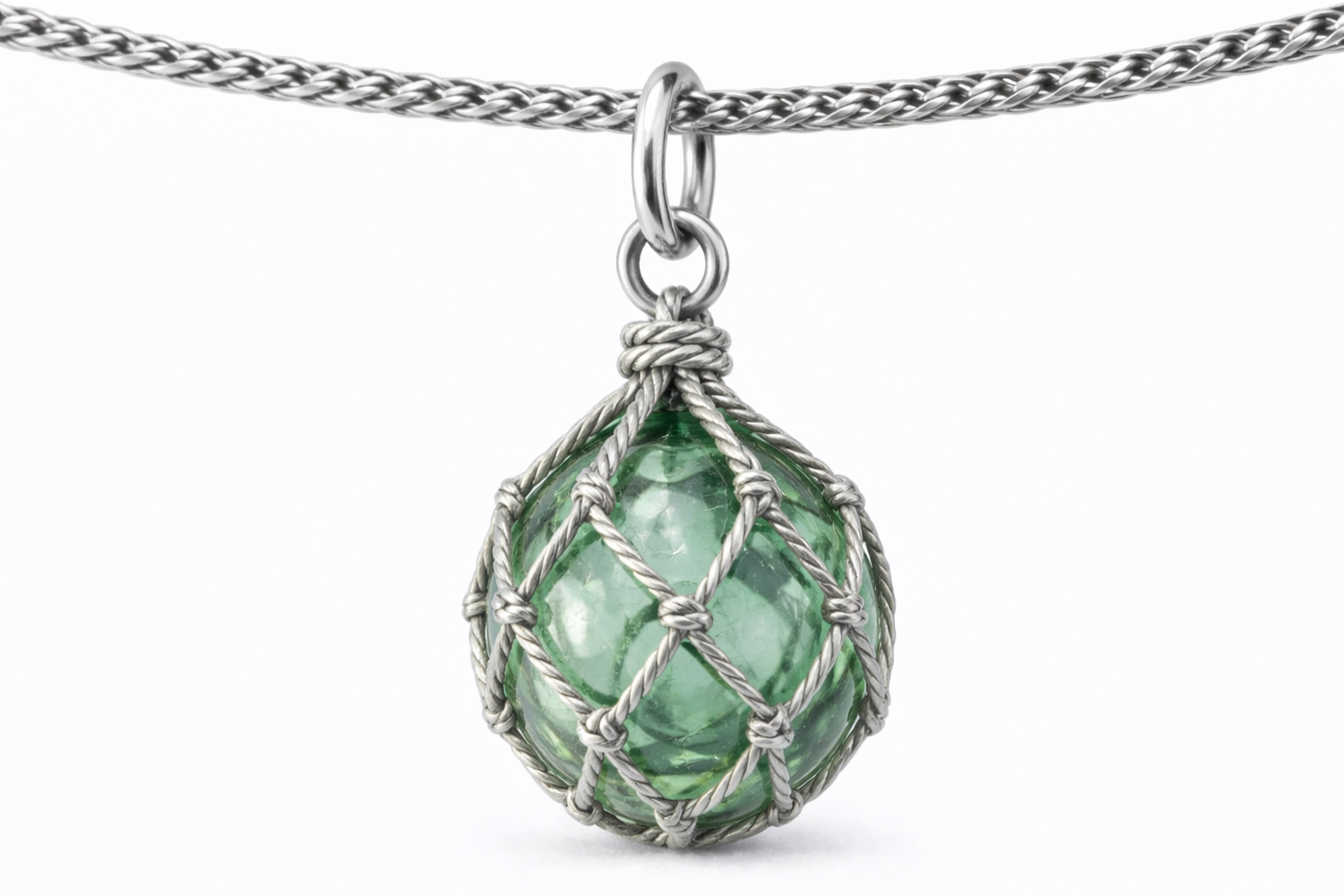 A hanging bead inspired by traditional hand-blown glass fishing floats, featuring a sea-green glass orb wrapped in sterling silver rope. A small raised detail marks the point where the glass was blown, honouring the handcraft behind the object. Suspended from a silver ring on the bracelet, the bead reflects a time when tools of the sea were made from natural materials, carrying stories of work, care, and respect for the ocean.