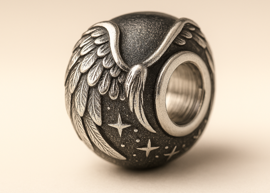 Ancient belief speaks of guardians who do not stand in front of us, but beside us. Their wings do not shield from life’s storms — they steady us within them. This bead honours that quiet presence: the strength that surrounds, the guidance that never leaves.