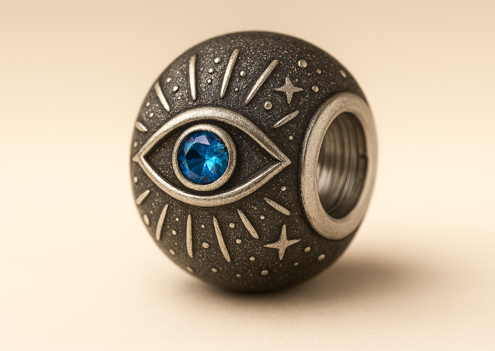 Across cultures, the Eye has been carried for centuries as a symbol of protection against ill intent — not through confrontation, but through awareness. The vivid blue gemstone at its centre represents clarity and truth, believed to reflect negativity outward while anchoring calm within.The aged silver texture honours ancient guardianship, as if this bead has already lived a lifetime of watchfulness.