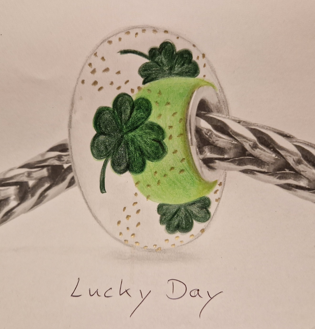 A transparent glass bead with four-leaf clover and a trail of gold will remind you of the things in life that went well and bring you luck for every day's new adventures!