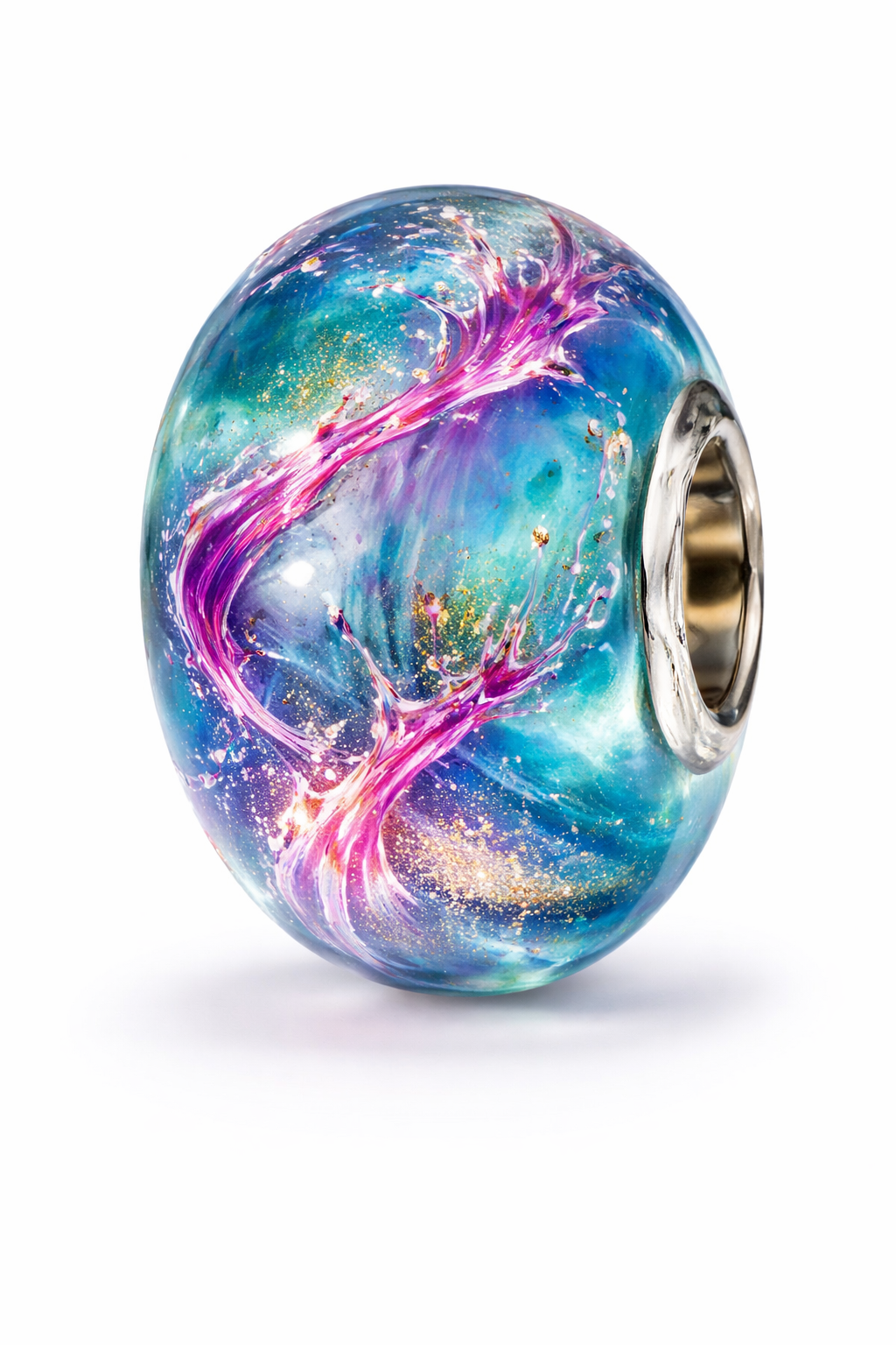 A blue glas-bead like a shimmering lake and a few magical pink-violett aetherflows in it -