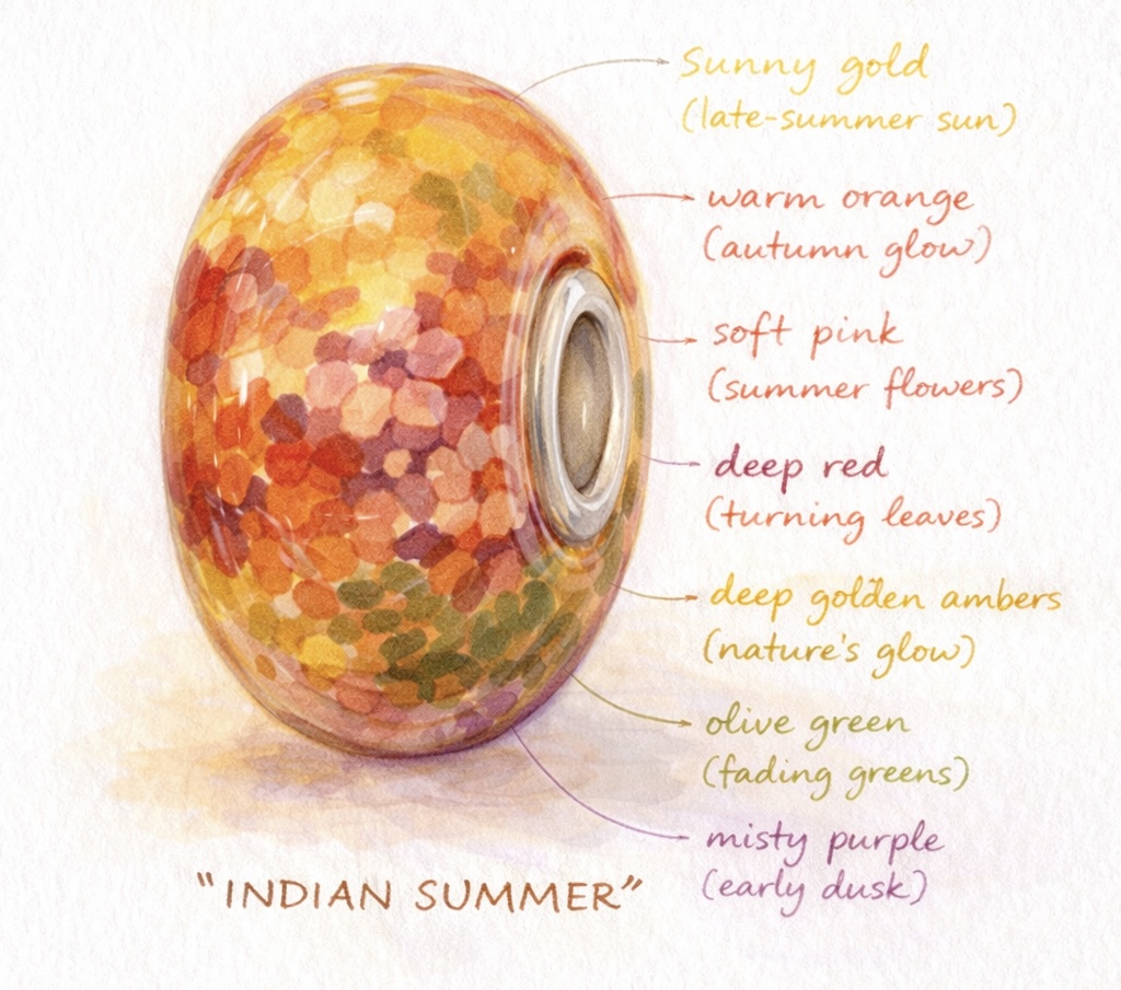The bead is built on a warm amber base that reflects late-season sunlight, layered with flowing tones of honey gold, sunset orange, soft rose, and deep burgundy, inspired by ripening fruit and changing leaves. Touches of olive green represent the last living hints of summer.