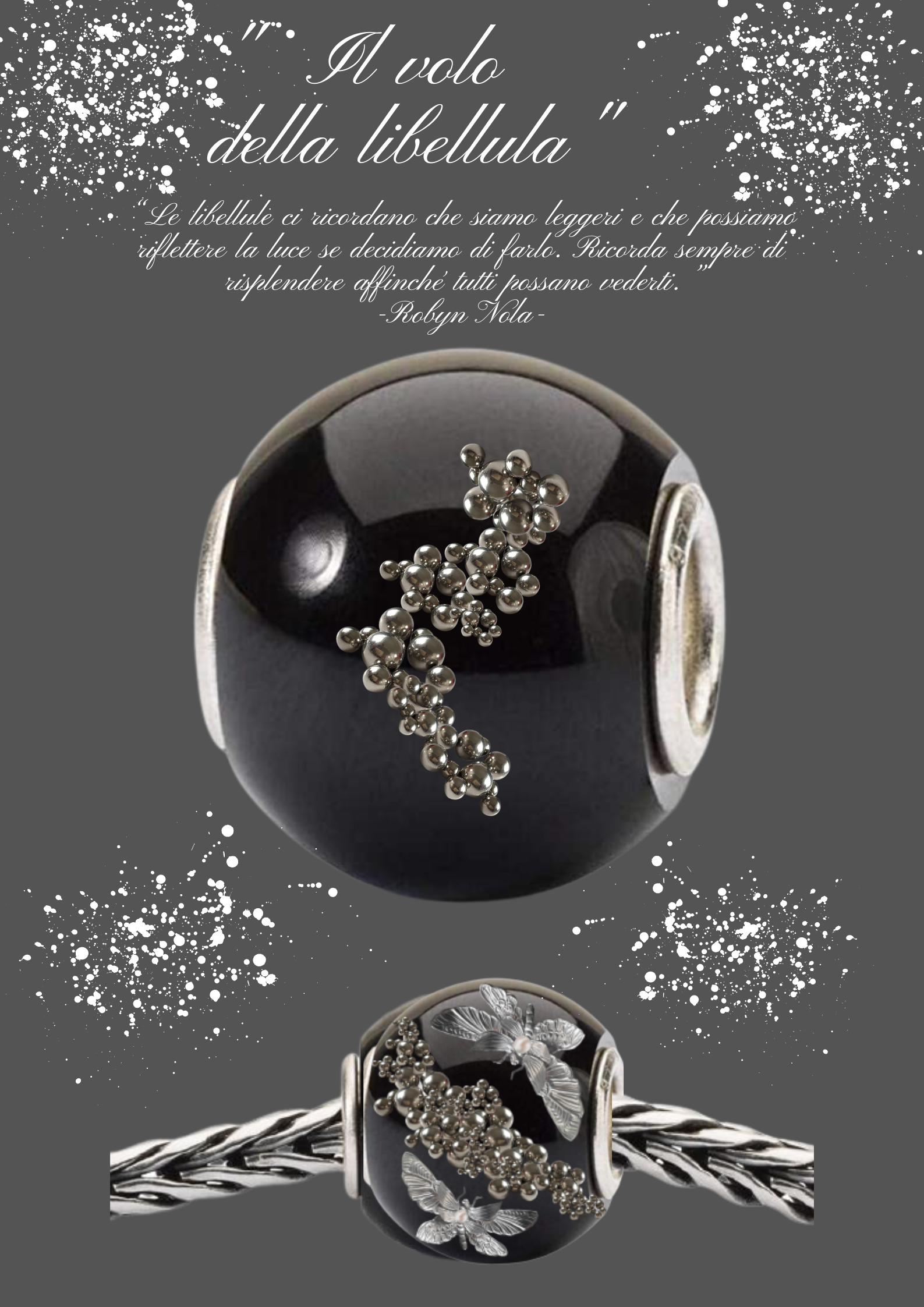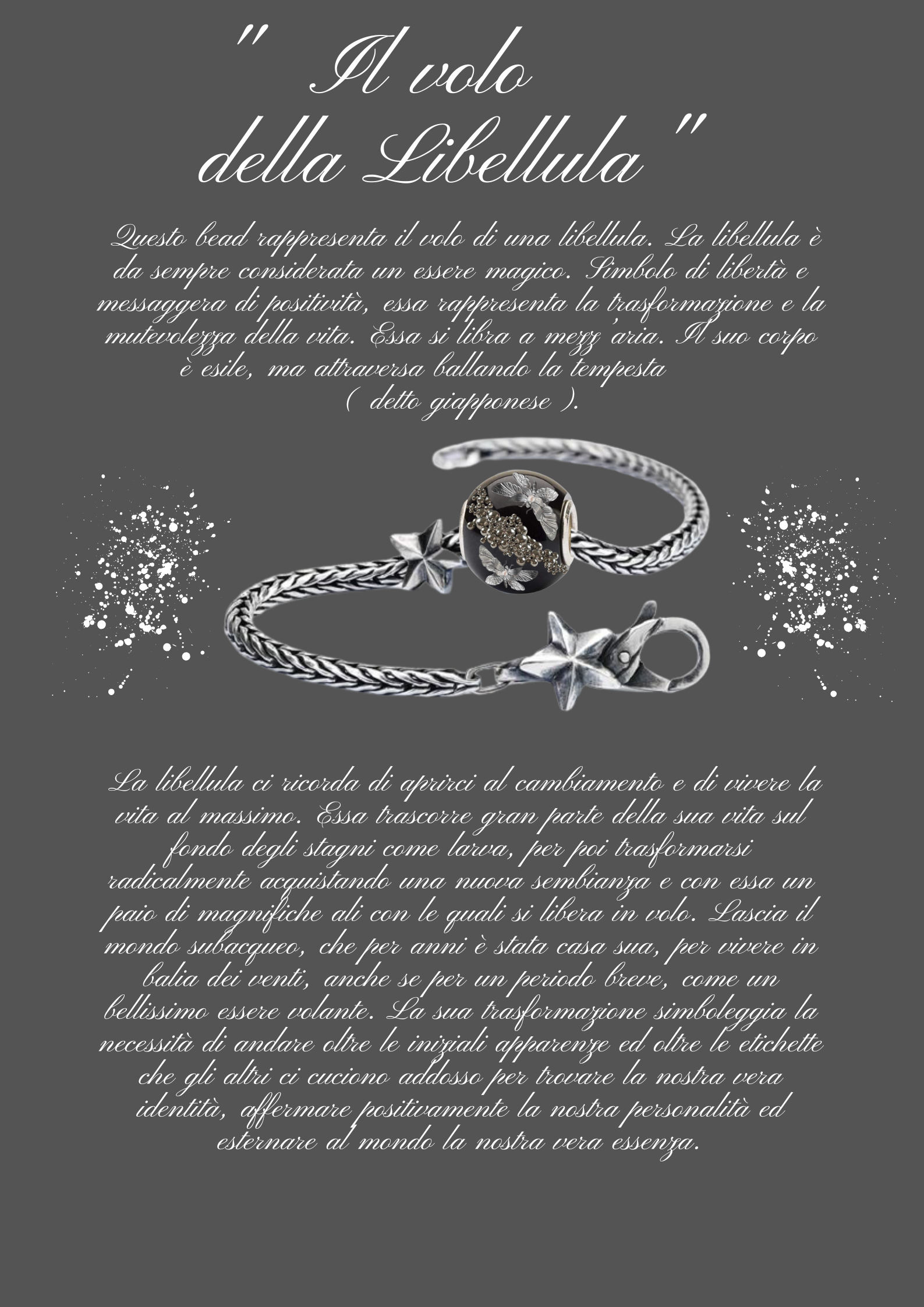 Questo bead rappresenta il volo di una libellula. La libellula è da sempre considerata un essere magico. Simbolo di libertà e messaggera di positività, essa rappresenta la trasformazione e la mutevolezza della vita. Essa si libra a mezz’aria. Il suo corpo è esile, ma attraversa ballando la tempesta