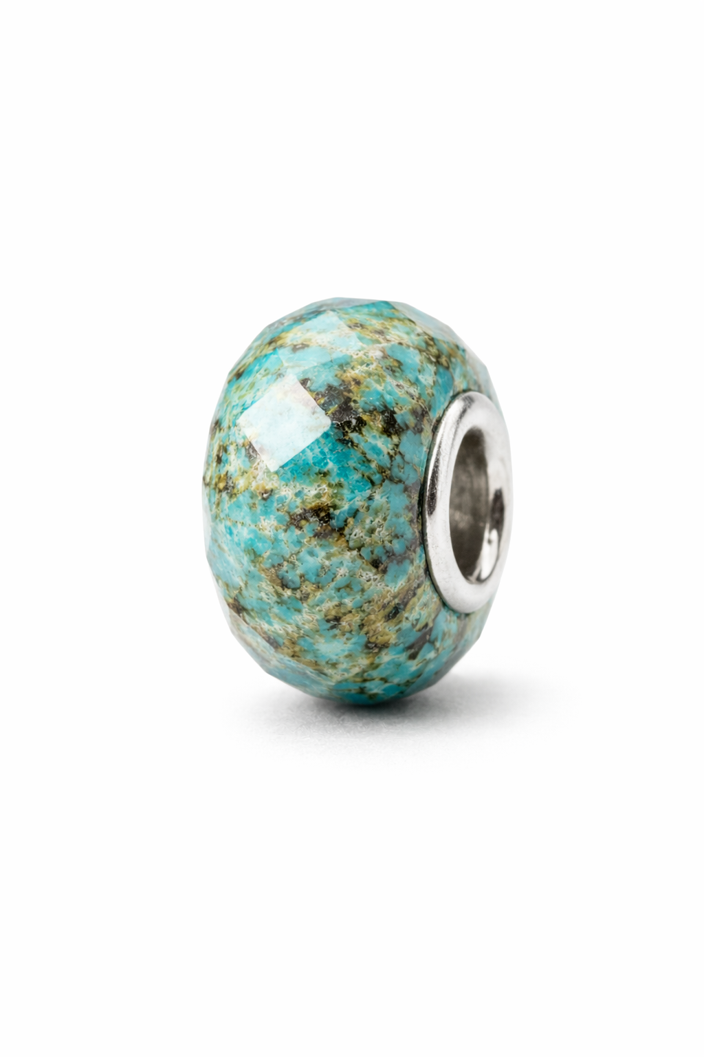 Il bead in vero Turchese sfaccettato cattura la luce in mille riflessi, rivelando le venature naturali della pietra, uniche come chi lo indossa. La superficie sfaccettata dona profondità e movimento al colore azzurro intenso, creando un contrasto raffinato con l’anima in argento che ne esalta la luminosità.