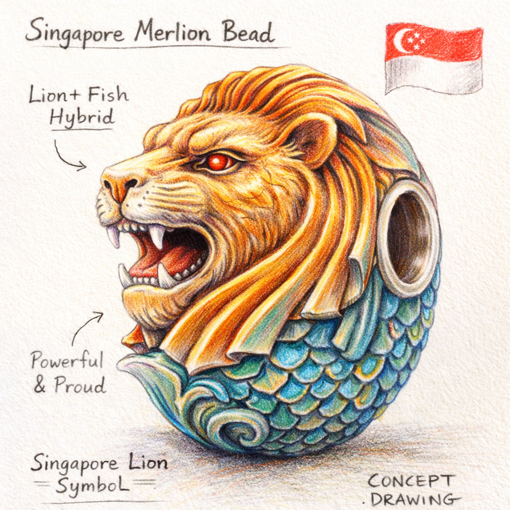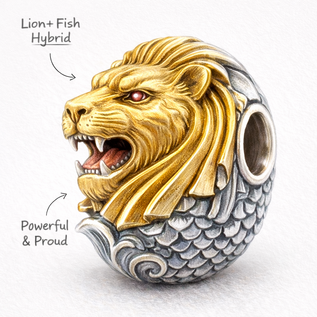 Inspired by Singapore’s Merlion, this bead represents strength rising from the sea and the meeting of cultures through trade and travel. The lion symbolises courage and leadership, while the flowing scaled body reflects the ocean and Singapore’s maritime heritage. Crafted in gold and silver, the bead celebrates harmony between power and fluidity, tradition and modern design.