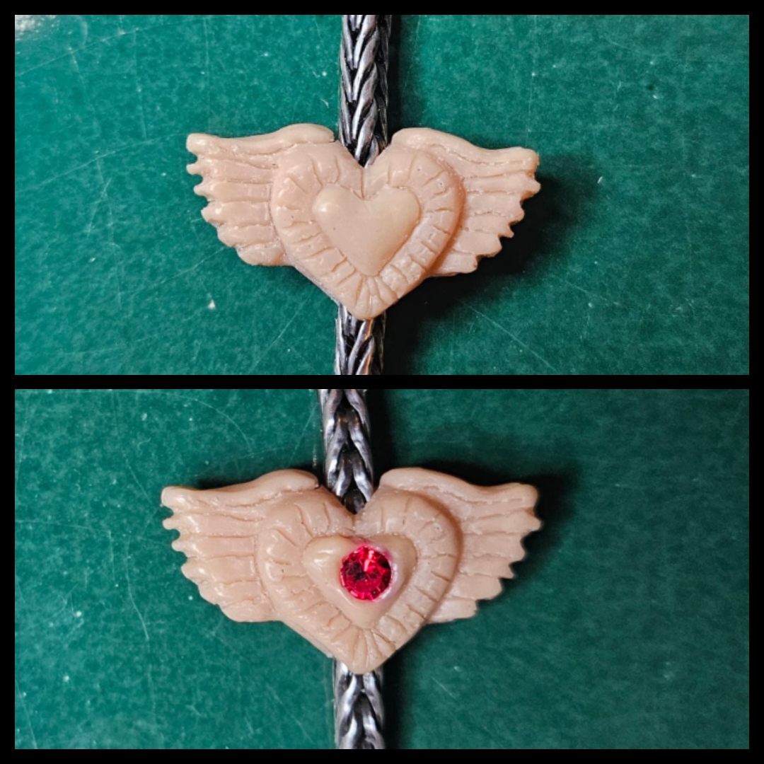 Bei dem Design handelt es sich um ein geflügeltes Herz im mexikanischen Stil. Auf einer Seite ist ein roter Glasstein eingearbeitet.