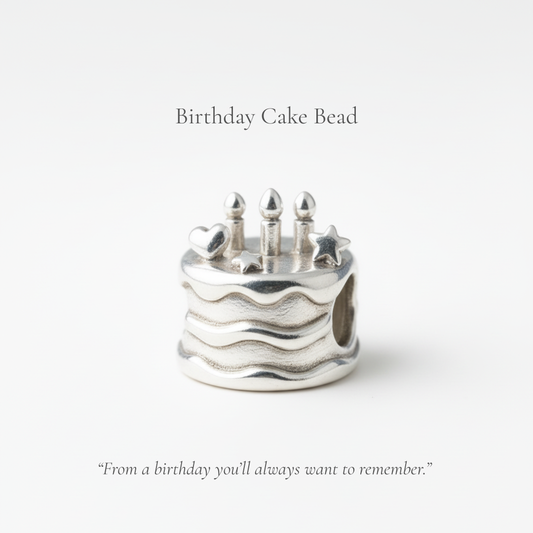 A silver bead celebrating a universally joyful moment ; birthdays, shared memories, and the simple pleasure of marking special days on a Trollbeads bracelet.