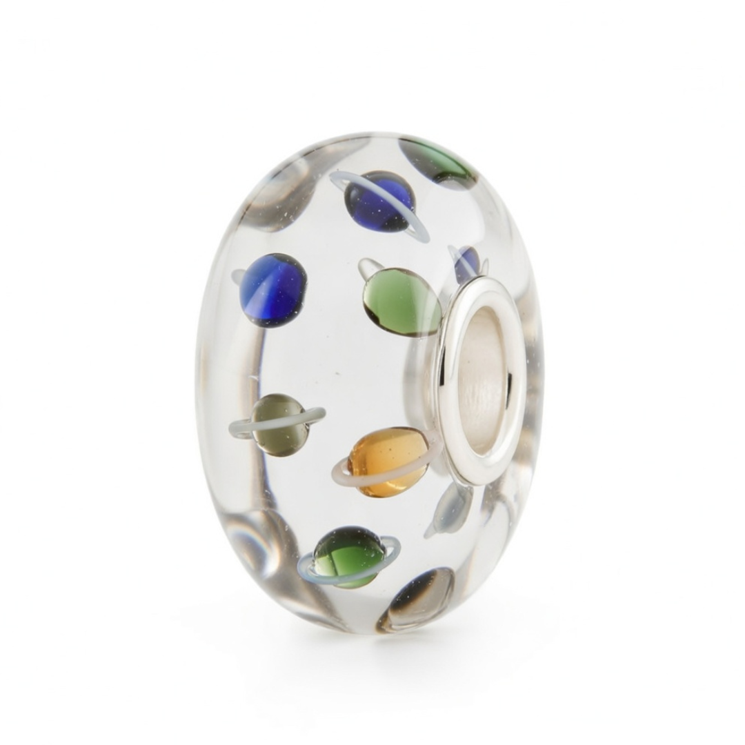 A glass bead with floating spheres and rings, inspired by planets. Minimal, playful, and focused on form and perspective. A glance at your wrist can be a small reminder of the planets above.