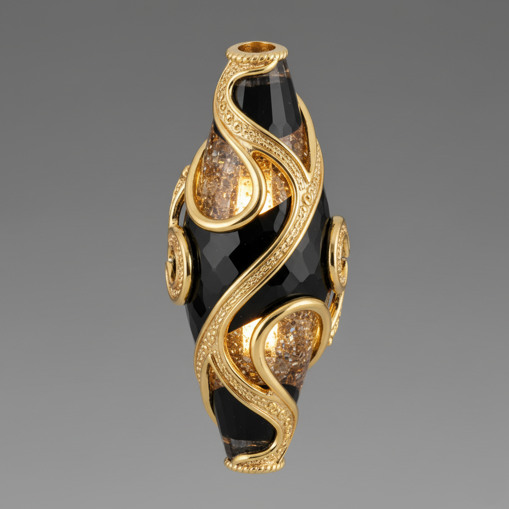 "CALAIS" is made of crystal, glass and gold details, it is part of the "spiral" bead collection.