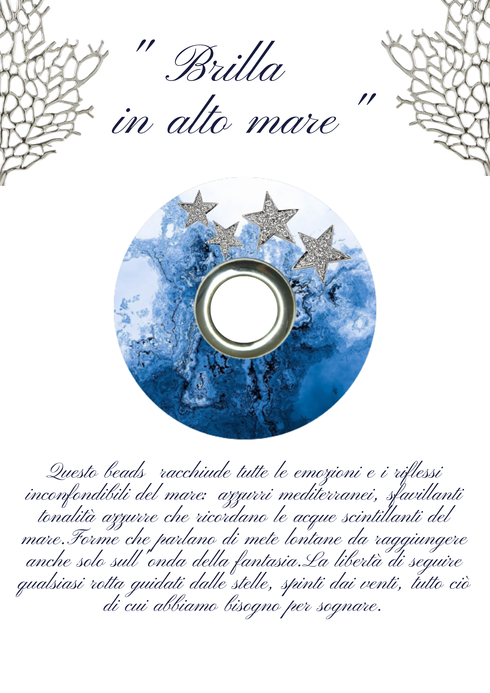 Questo splendido beads si ispira al colore cangiante del mare, presenta un motivo marmorizzato in tonalità di blu e bianco che ricorda le onde spumeggianti e i movimenti dell’acqua. Racchiude tutte le emozioni e i riflessi inconfondibili del mare: azzurri mediterranei, sfavillanti tonalità azzurre che ricordano le acque scintillanti del mare.L'azzurro del mare in tutte le sue sfumature è impreziosito dalla luce degli zirconi che sono di un blue profondo.Forme che parlano di mete lontane da raggiungere anche solo sull'onda della fantasia.La libertà di seguire qualsiasi rotta guidati dalle stelle, spinti dai venti, tutto ciò di cui abbiamo bisogno per sognare.