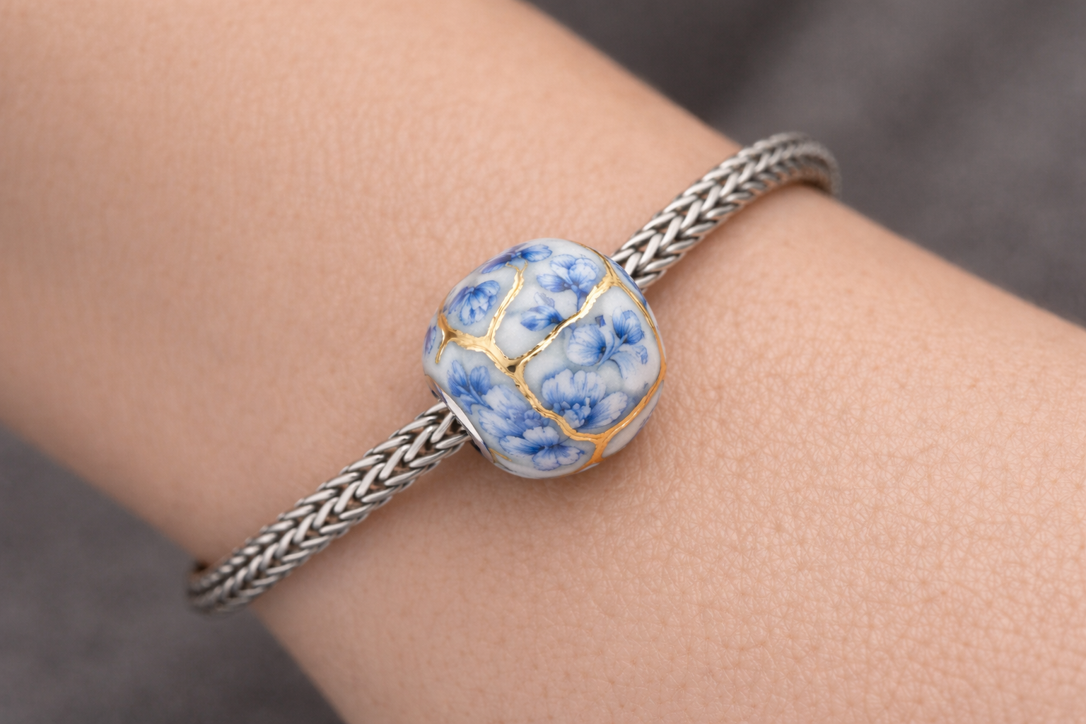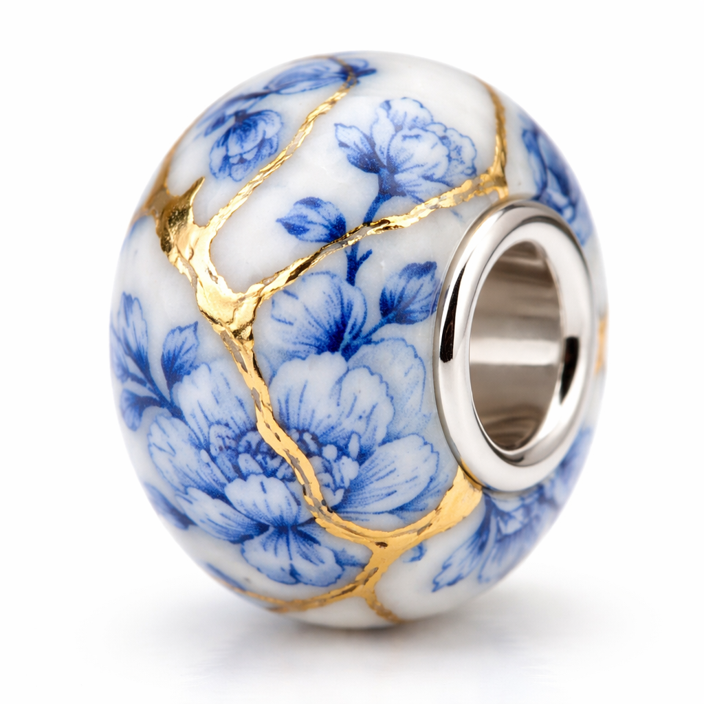 Questo beads, esalta l’arte giapponese del kinsugi. Un’arte che valorizza l'unicità dell'oggetto riparato, evidenziando le cicatrici come parte preziosa della sua storia.Le crepe, invece di essere nascoste, vengono impreziosite con oro, rappresentando la trasformazione della fragilità in un punto di forza.L'oggetto, dopo la rottura, non torna come prima, ma diventa più bello e resistente, rappresentando un percorso di guarigione. Il Kintsugi insegna ad accettare che gli oggetti e la vita cambiano. Questo beads vuole simboleggiare il cambiamento e la trasformazione che ci accompagna nella vita per questo,Rinascita.