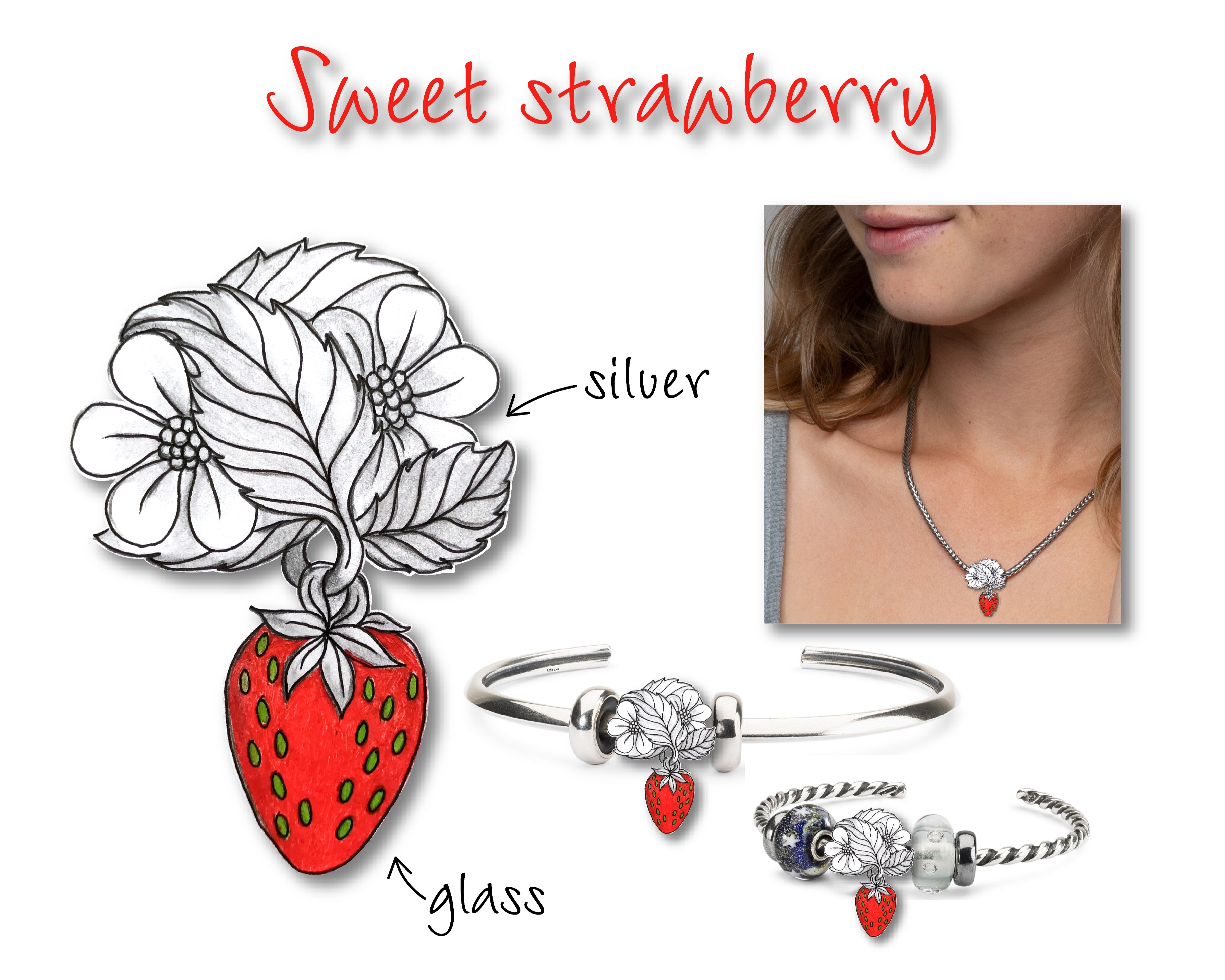 My suggestion for a new Trollbead is this piece of glass and silver. It shows a strawberry with its flowers and leaves. The strawberry itself is made of glass, in a beautiful red color. Small green spots/seeds in the red glass. The flowers and leaves, the "crown" over the berry, is made of silver... or gold.