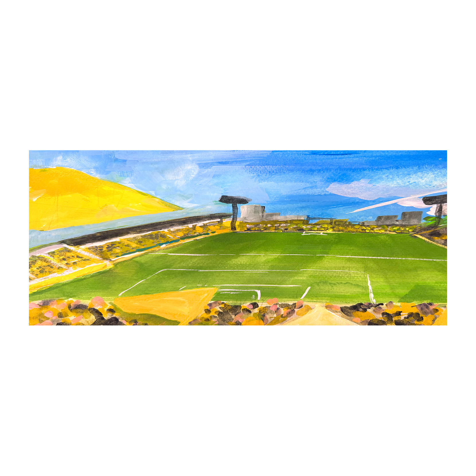Blue sky, green grass, yellow flags. Amazing space!
