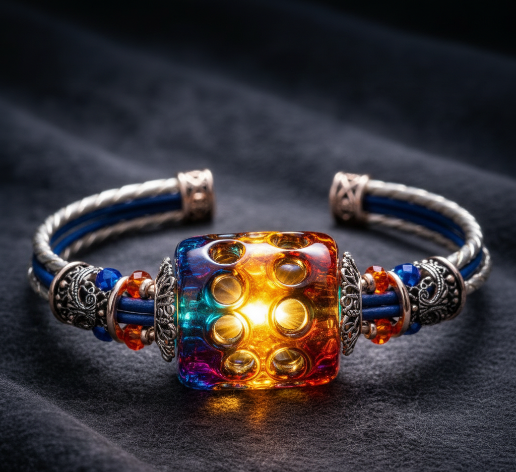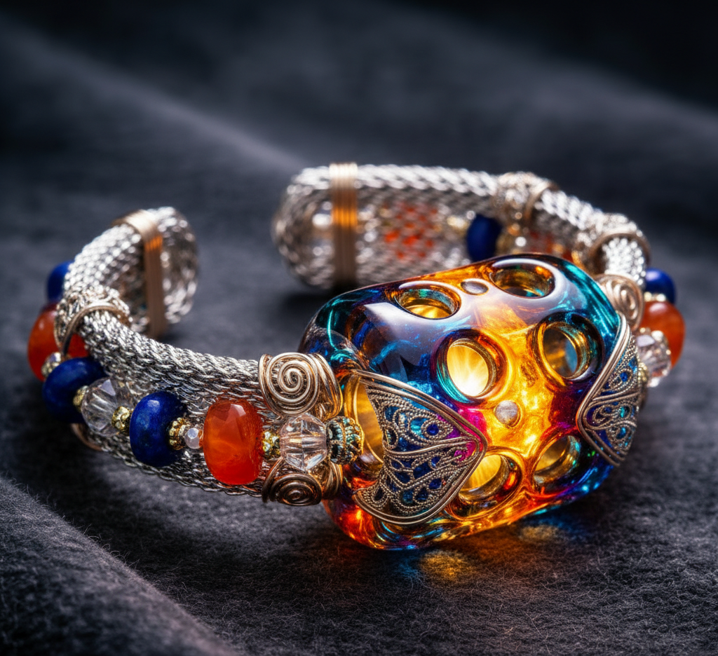 The interplay of colored transparencies creates unique chromatic effects, plays of light and depth, often enhanced by artisanal techniques such as layering gems or specific cuts. They lend an ethereal and sophisticated look, allowing light to pass through the material.