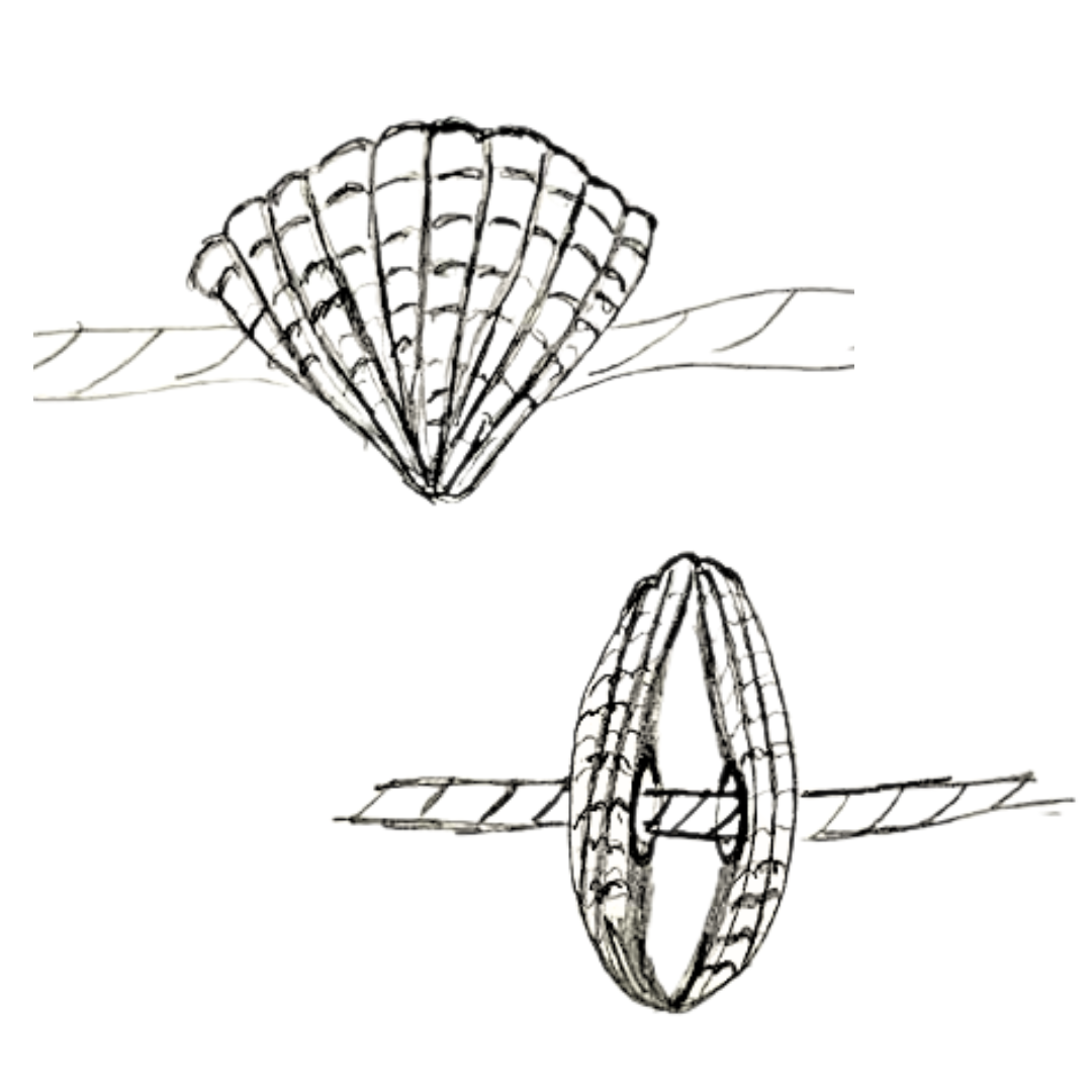 Two shells locked together at the top and bottom, half round so you can see the chain in between. Symbolizing the love that lock together, and the bond that goes between.