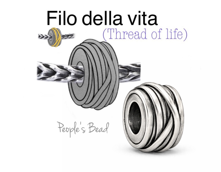 Il “filo della vita” rappresenta la vita di ciascuno di noi, ogni vita è sicuramente diversa da quella di chiunque altro ed è per tutti unica e irripetibile. Il beads nasce pensando all’anello creato rifacendosi alla fede tibetana; l'anello che la madre della sposa regala alla figlia, come augurio di buona vita, prima che lasci la casa. Ogni giro del filo è un traguardo importante raggiunto, giorno dopo giorno. Un bead per augurare buona Vita a tutti quelli che lo indossano. Possibile realizzazione tutto argento, tutto oro o argento ed oro .