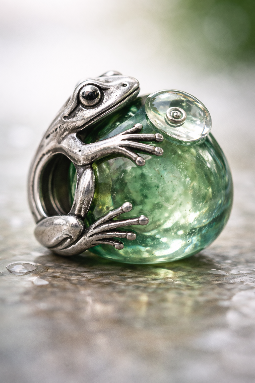 This bead captures the delicate grace of a frog, gently embracing a shimmery green glass orb. The frog symbolizes transformation, renewal, and the quiet magic of nature, while the tiny silver spiral within the dewdrop represents the hidden beauty and stories that lie beneath the surface.