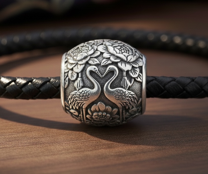 Symbols of longevity, grace and elegance, these 2 embracing cranes are surrounded by beautiful peonies. This silver barrel is inspired by traditional Chinese paintings.