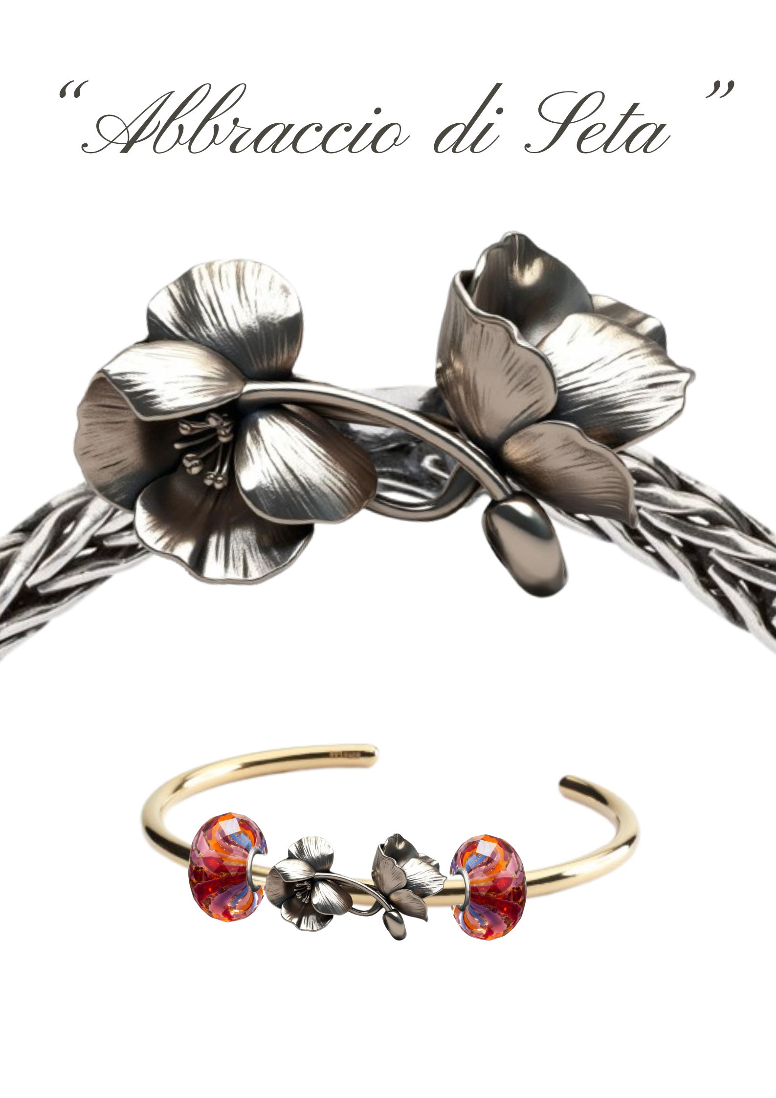 Il bead porta con se la bellezza dei fiori di campo, racconta una storia di crescita e unione. Rappresenta due papaveri e un bocciolo uniti in un unico legame, un “abbraccio” intrecciato: un fiore grande e aperto (con petali leggermente increspati e irregolari per naturalismo), e un fiore leggermente più piccolo medio-aperto e un piccolo bocciolo in una fase diversa della fioritura, pronto a sbocciare (bocciolo vs fiore aperto) per creare dinamismo, uniti in un elegante e sinuo-so abbraccio grazie alla elegante rotazione e torsione degli steli in oro o argento. I gambi in-trecciati formano il foro passante per l’inserimento del bracciale o della collana. Il metallo prezioso (l’argento) abbraccia le forme naturali del fiore creando una struttura resistente ma delicata. Questo bead evoca molta poesia, dinamismo e natura. Il concetto di "abbraccio" unito alla torsione degli steli suggerisce oltre all’eleganza movimento continuo, inoltre la Fase di Fioritura rap-presenta il ciclo della vita ( un bocciolo, non ancora aperto, emerge dal punto di torsione più basso, aggiungendo dinamismo e rappresentando il ciclo della vita).