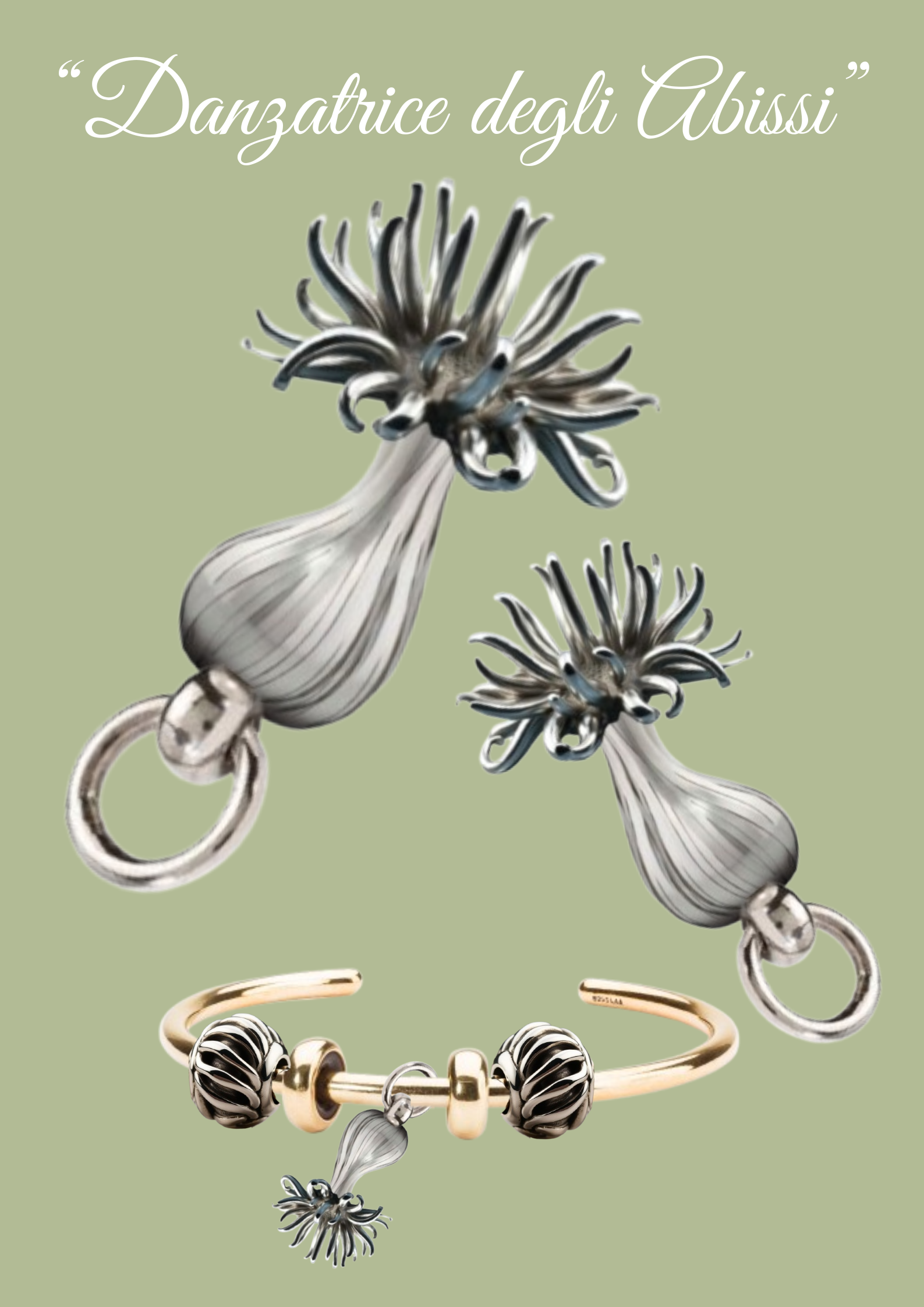 Un bead ispirato alla "danza" dell'anemone di mare, rappresenta un connubio tra eleganza naturale, protezione, mistero e forza silenziosa. Definita anche "fiore del vento" o ninfa dei mari nella mitologia greca, l'anemone simboleggia una bellezza libera, leggiadra e in continuo mutamento, che si adatta alle correnti marine. Simboleggia la capacità di adattarsi alle correnti della vita con grazia e fluidità, mantenendo la propria unicità. Il design, caratterizzato da tentacoli sinuosi in argento, evoca il movimento ipnotico e delicato dell'anemone sott'acqua, cattura l'affascinante e profondo mistero degli abissi, simboleggiando una forza interiore silenziosa ma persistente. simbolo di una vita vissuta con leggerezza e armonia. Una Bellezza fragile e fiera: rappresenta la dualità dell'anemone, che appare delicato e poetico ma è anche resiliente. Celebra la "dolce vulnerabilità" e la forza di chi resta fedele a se stesso.