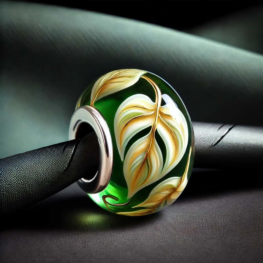 A bead featuring intricate golden leaves set against a vibrant green backdrop, symbolizing the harmony of nature and artistry.