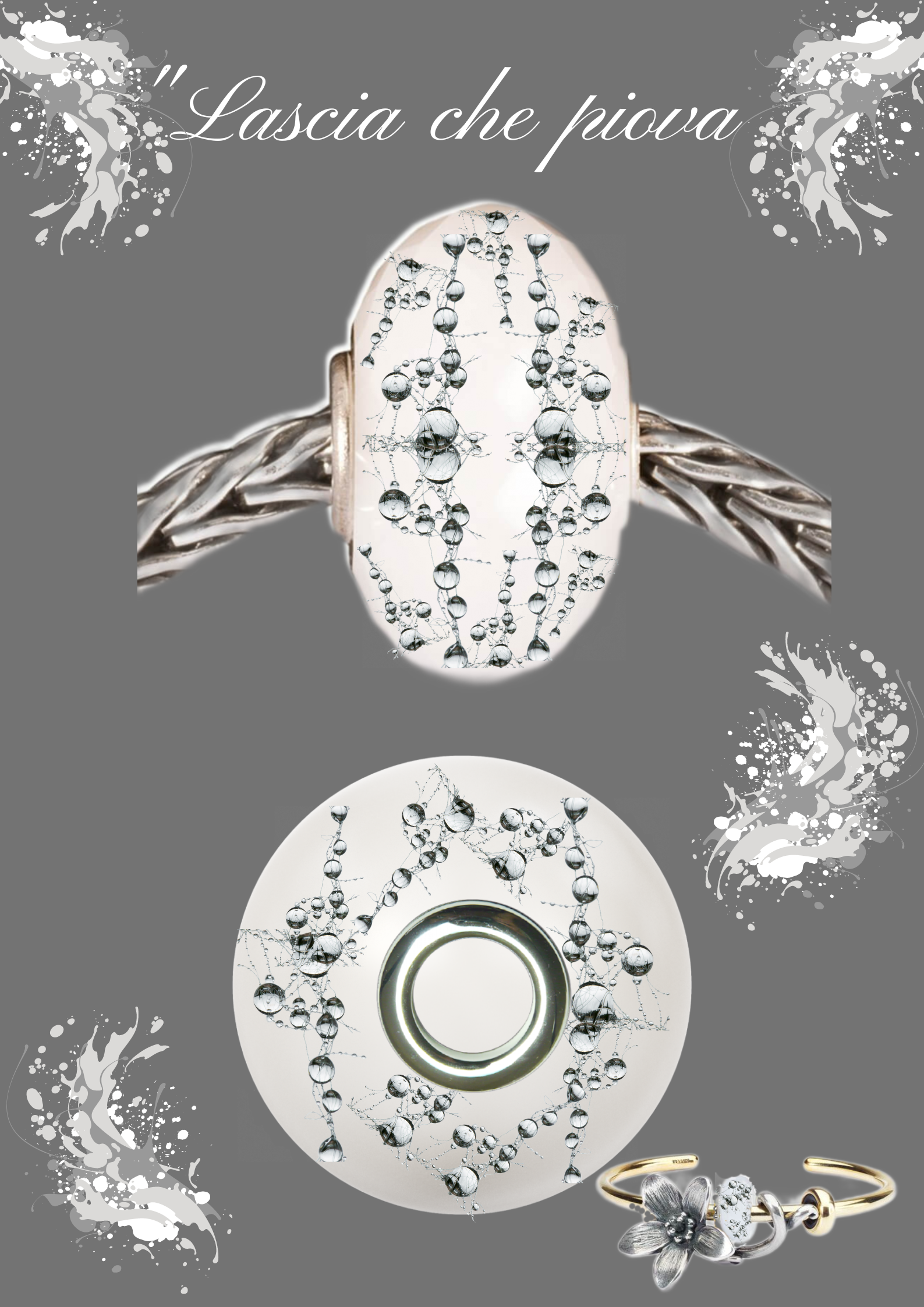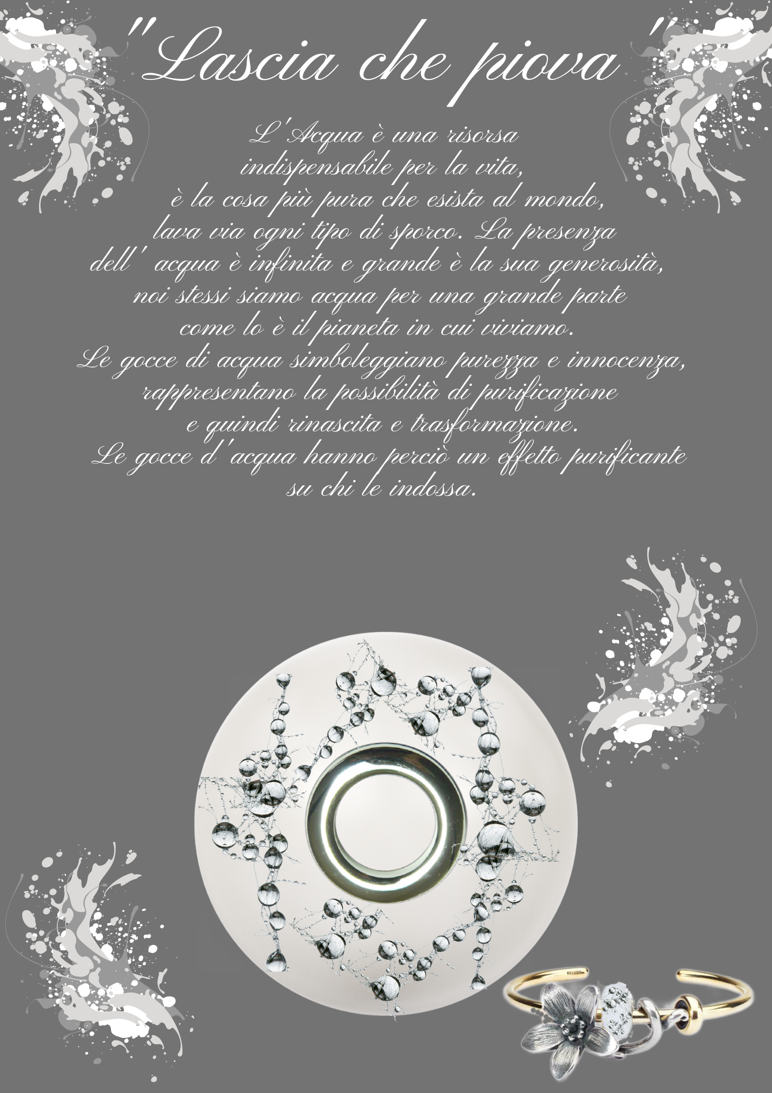 lava via ogni tipo di sporco. La presenza dell' acqua è infinita e grande è la sua generosità, noi stessi siamo acqua per una grande parte come lo è il pianeta in cui viviamo. Le gocce di acqua simboleggiano purezza e innocenza, rappresentano la possibilità di purificazione e quindi rinascita e trasformazione. Le gocce d'acqua hanno perciò un effetto purificante su chi le indossa.