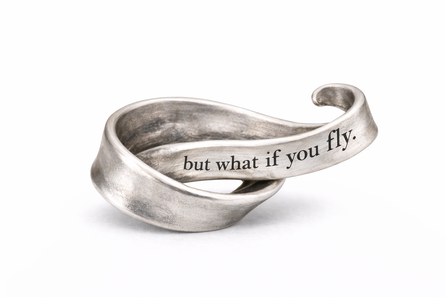 A softly twisting sterling silver ribbon bead, shaped as if caught mid-flight, with the engraved words “but what if you fly” flowing along its curve — a quiet reminder that courage often begins where fear loosens its grip.