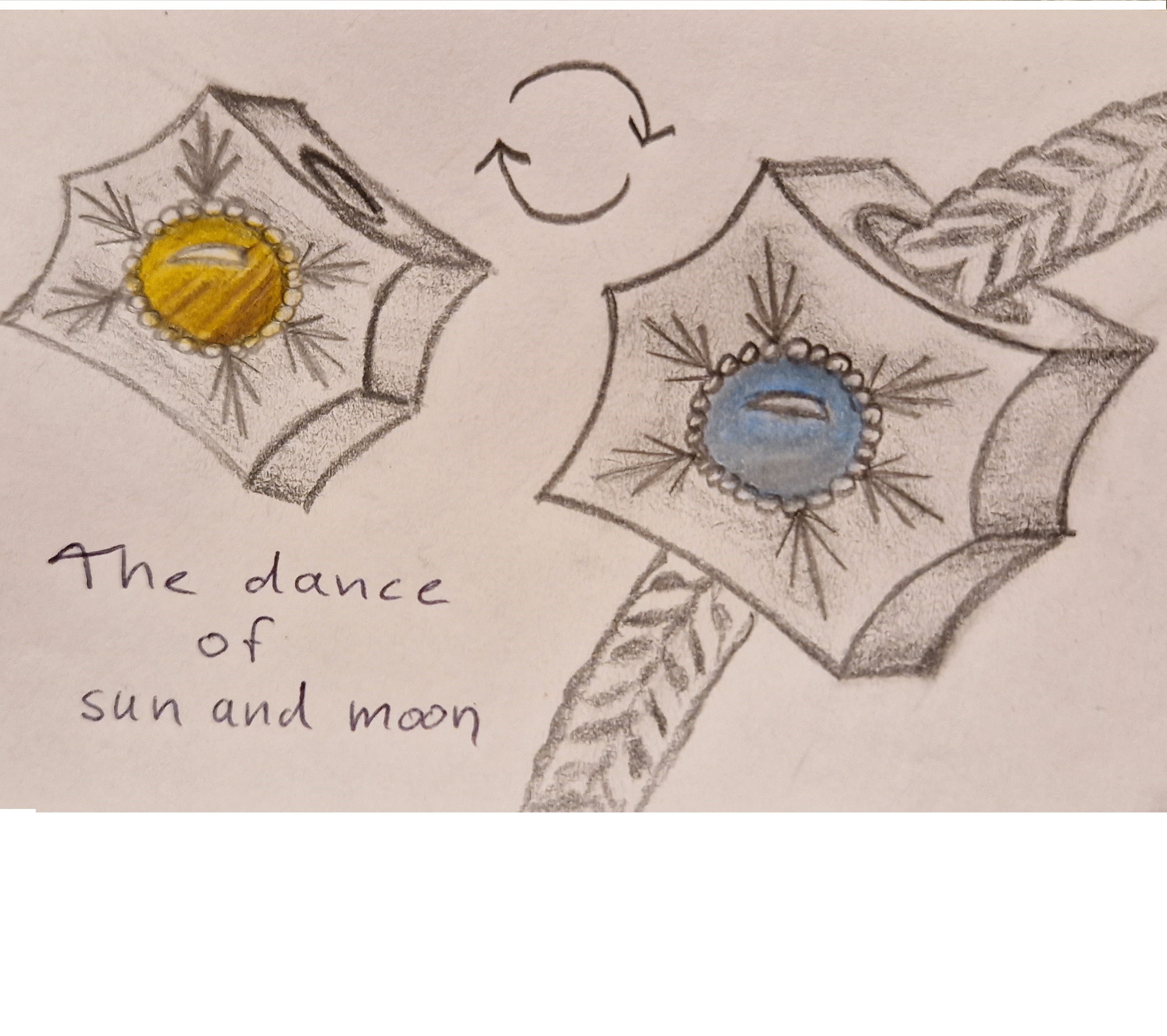 A silver bead with two different sides, one side with a cool, blueish moonstone, the other with a warm, golden tiger's eye stone. When the bead moves and hence turns on your bracelet, it represents the circle of night and day, the endless dance of sun and moon