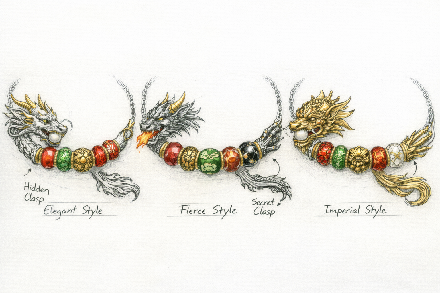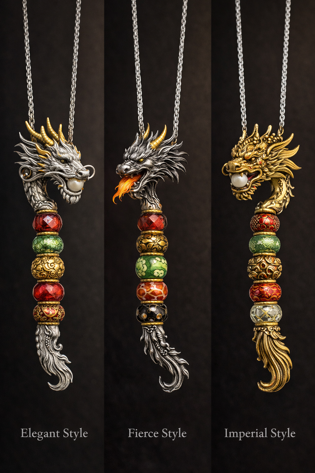 The dragon’s body is open, allowing up to 6 beads to sit between the head and tail, similar in spirit to the Guardian of Love fantasy necklace—but distinctly Eastern in form and meaning.