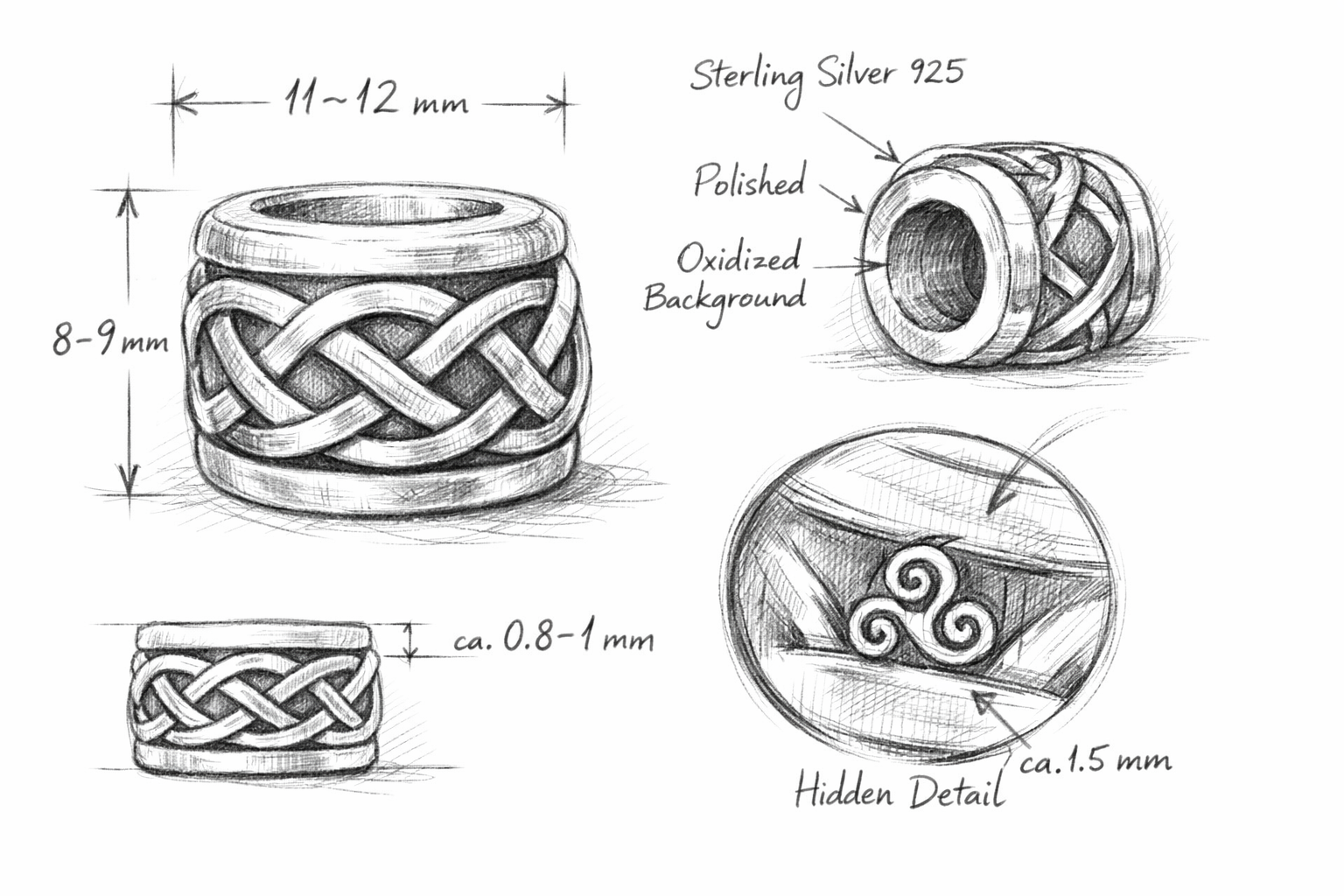 Umlaufendes keltisches Knotenmuster, das nahtlos um den Bead verläuft (kein klarer Anfang oder Ende - Symbol der Ewigkeit)