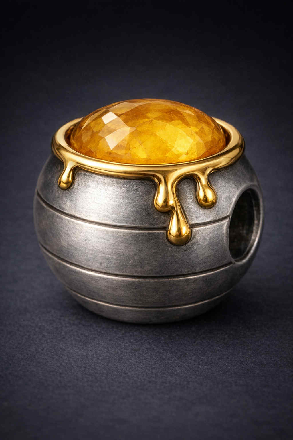 A silver pot bead topped with a glowing glass detail, encircled by a gold rim that drips like molten honey.