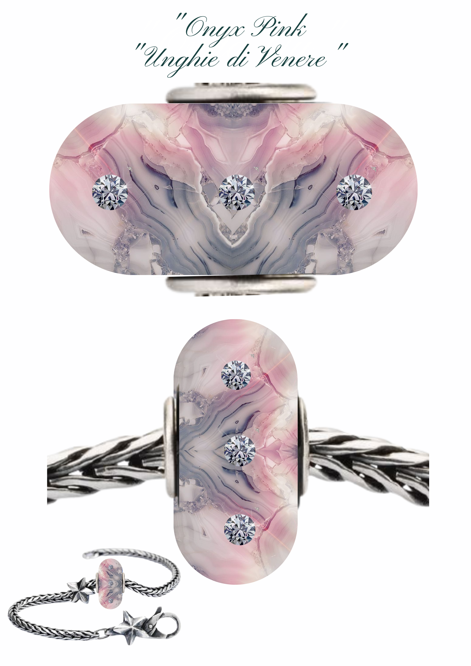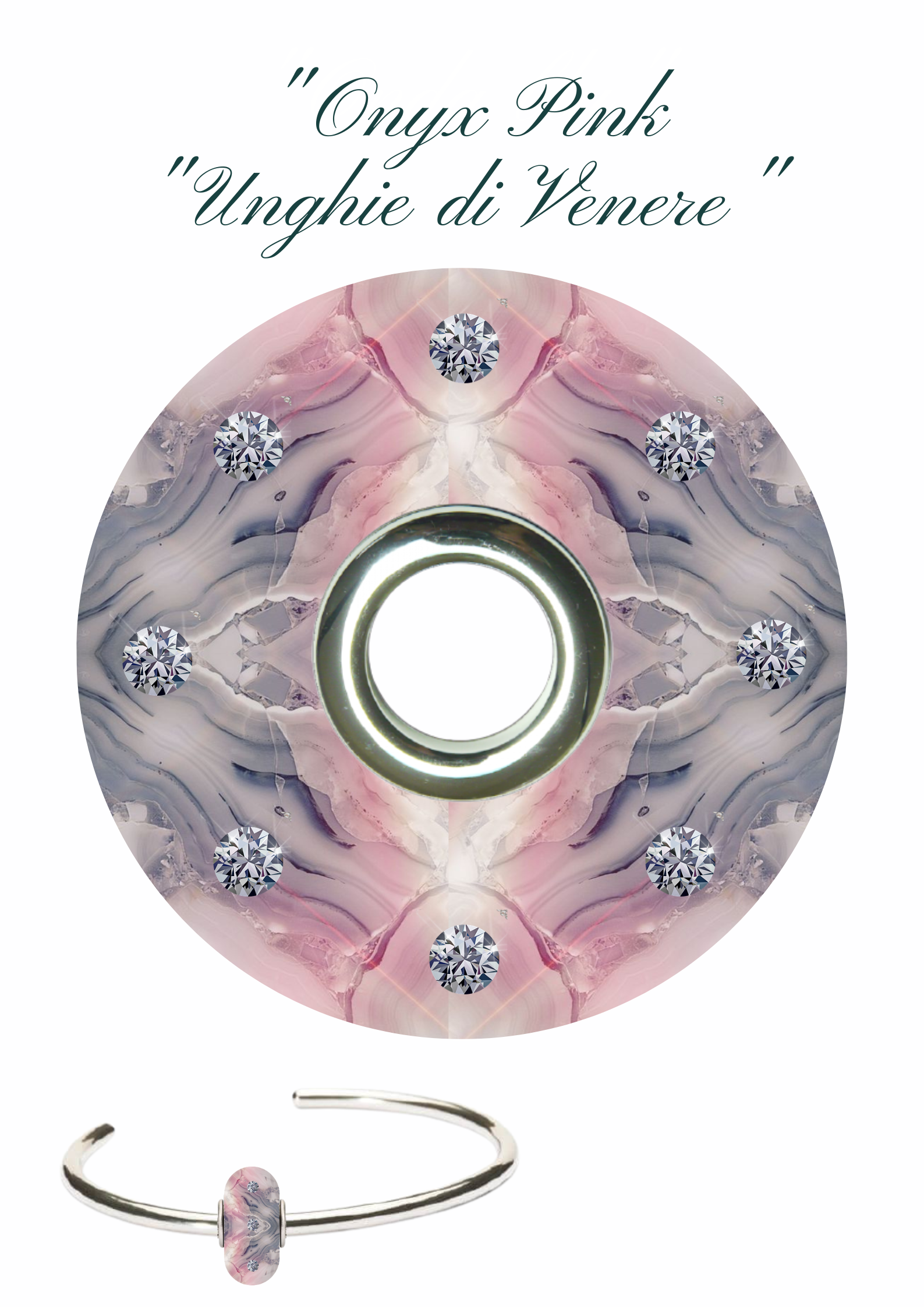 Un bead in onice dai toni pastello, un rosa intenso con intrusione di bianco e grigio che conferiscono un fascino chic a chi lo indossa.