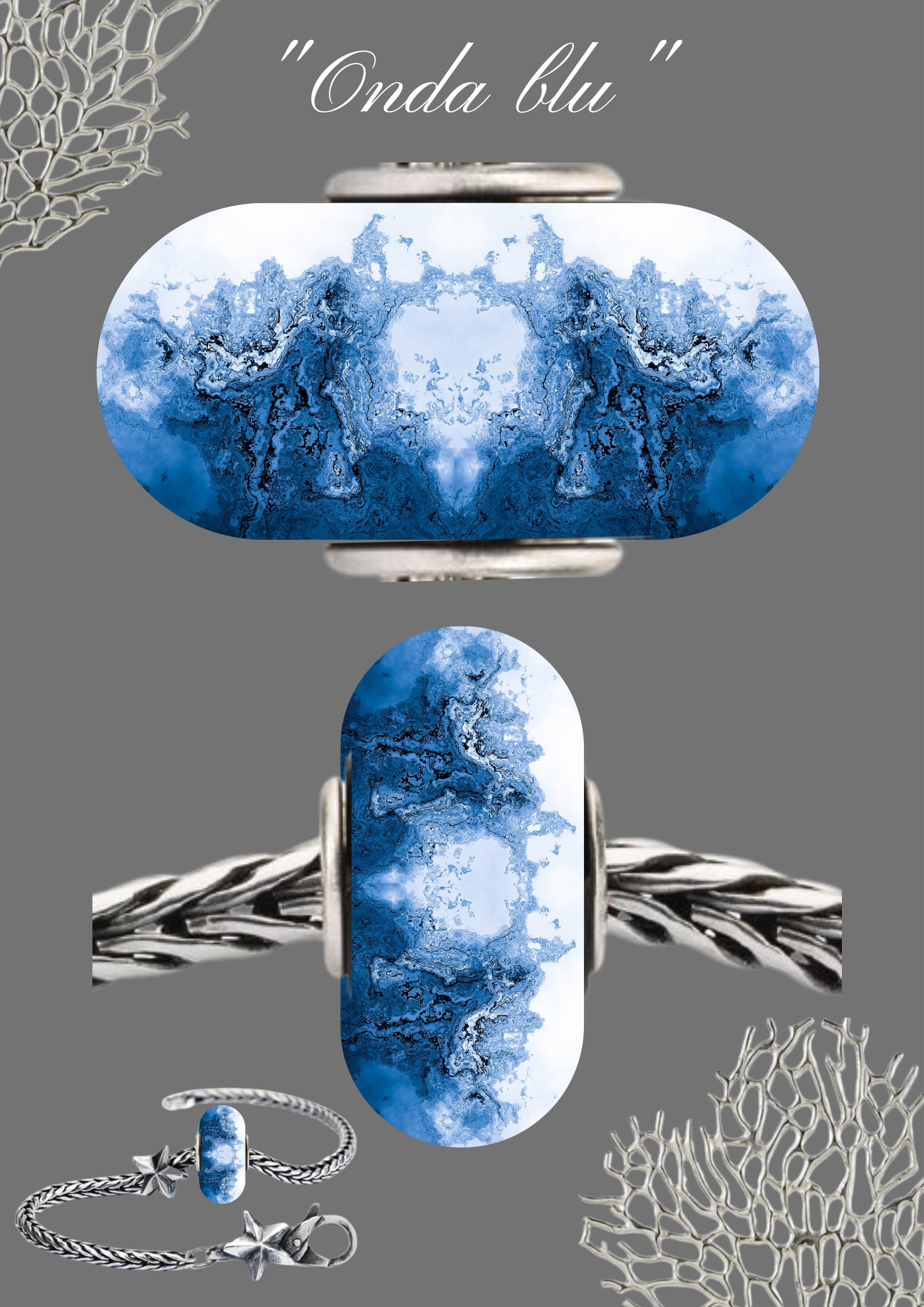 Questo splendido beads si ispira al colore cangiante del mare, presenta un motivo marmorizzato in tonalità di blu e bianco che ricorda le onde spumeggianti e i movimenti dell’acqua. Racchiude tutte le emozioni e i riflessi inconfondibili del mare: azzurri mediterranei, sfavillanti tonalità azzurre che ricordano le acque scintillanti del mare.Forme che parlano di mete lontane da raggiungere anche solo sull'onda della fantasia.La libertà di seguire qualsiasi rotta guidati dalle stelle, spinti dai venti, tutto ciò di cui abbiamo bisogno per sognare.