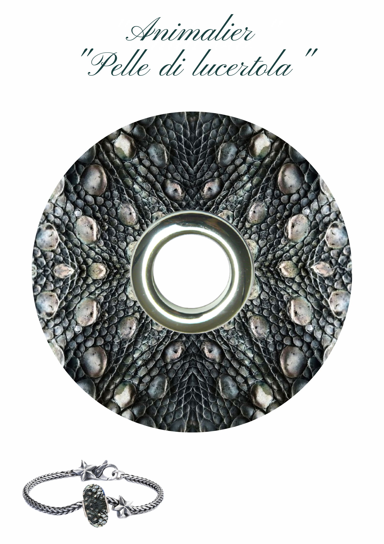 Animalier: "Pelle di Lucertola""è un omaggio alla Natura Selvaggia.Questo bead animalier presenta una texture sorprendente a pelle di lucertola in argento brunito e scaglie lucenti tipiche di questo animaletto, dove luce e ombra si rincorrono magicamente. La Lucertola è un animale a cui viene attribuita una forte carica simbolica :rappresenta forza e capacità di sopravvivenza, rappresenta inoltre il valore dell’adattabilità, un valore necessario all’animale come all’uomo, per poter sopravvivere e andare avanti anche quando sulla nostra nostra strada si pongono ostacoli che possono sembrare invalicabili. Sapersi adattare ad ogni situazione andare sempre avanti senza mai arrendersi è l’insegnamento che l’uomo deriva da questo piccolo rettile, tenace e tranquillo. La lucertola è simbolo di immortalità perché richiama il concetto di rigenerazione. Incarna l'eternità della luce ed è per questo motivo presente in molti monumenti, essendo considerata anche una guida per viaggiare nel mondo degli spiriti.La lucertola è anche simbolo di fortuna e per questo motivo nelle case salentine è sempre ben accetto e mai allontanato. Tuttavia, non è racchiuso solo questo significato dietro alla rappresentazione della lucertola. Affezione, benevolenza e fedeltà sono infatti espressione dell'essenza simbolica di questo animaletto.Incontrarne una sul proprio cammino costituisce presagio di fortuna e successo.Potrebbe essere un incitamento ad usare le tue capacità ed il tuo senso dell'avventura per migliorare te stesso.