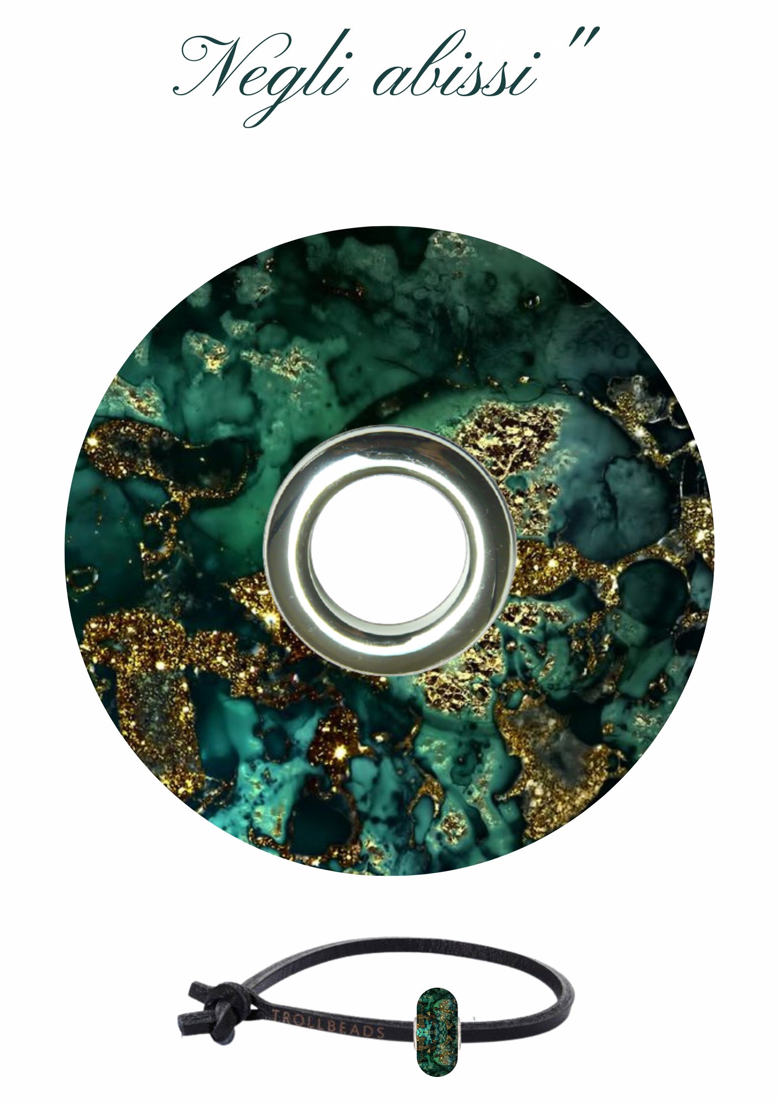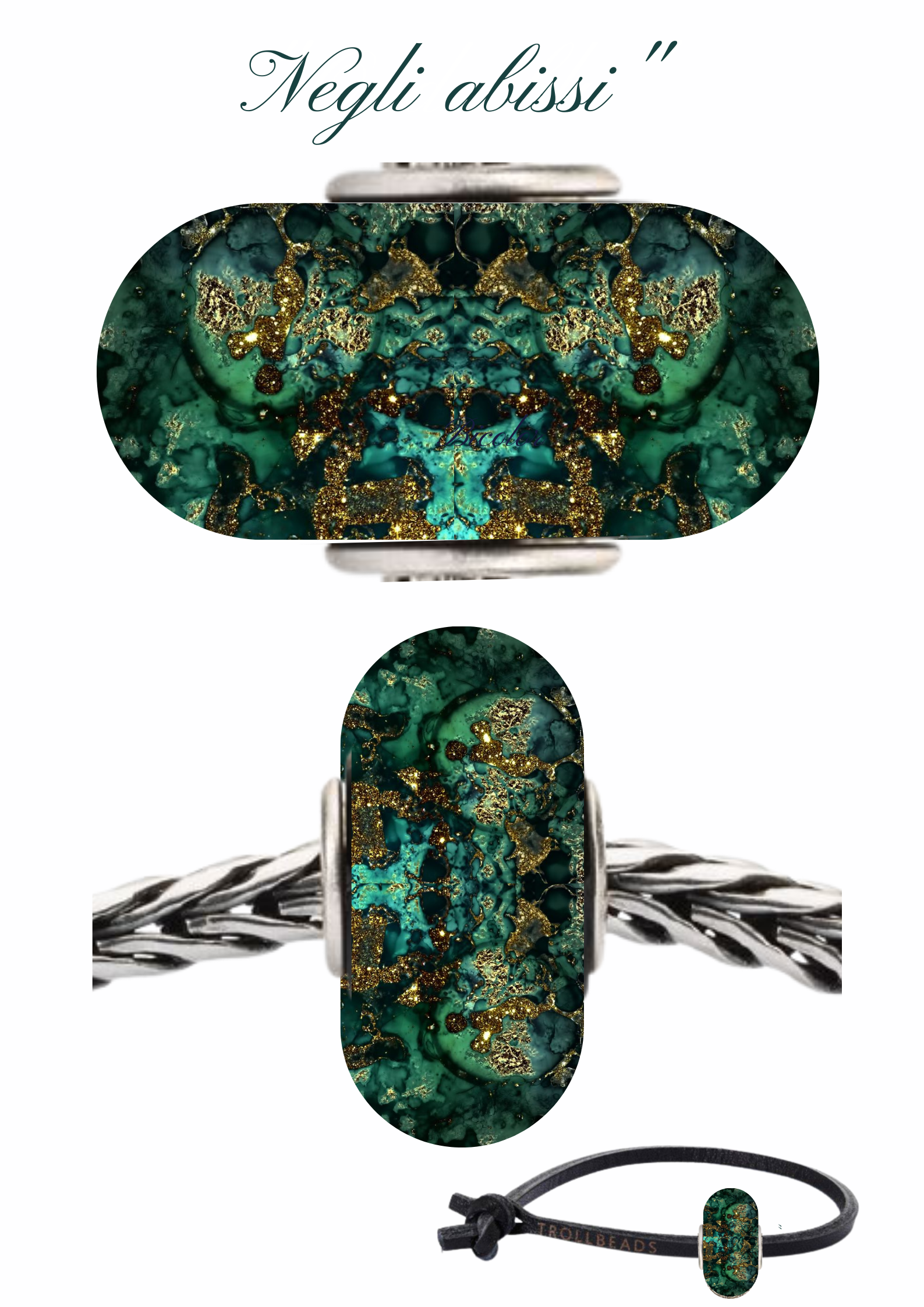 Un beads ricco di fascino ispirato ai fondali marini,ne richiama il fascino misterioso attraverso i colori e la texture che evocano le sfaccettature più intense.Una sinfonia di colori legati alla profondità e alla lucentezza del mare. Una superficie verde turchese brillante che rievoca le profondità dei fondali marini tropicali attraverata da striature e macchie dorate generate dal riflesso del sole .Riflette luci brillanti.Il mare è un quadro mutevole di emozioni, capace di esprimere sia la tristezza che la gioia,con le sue profondità inesplorate è un territorio di sublime bellezza, custodisce segreti e cela misteri, osservandolo ci catapultiamo in un viaggio senza tempo verso l’ignoto.Un mare in miniatura da portare sempre con noi, che ci trasporta verso mondi fantastici, consentendoci di abbandonare la monotonia della realtà per immergerci in universi di magia ed incanto.