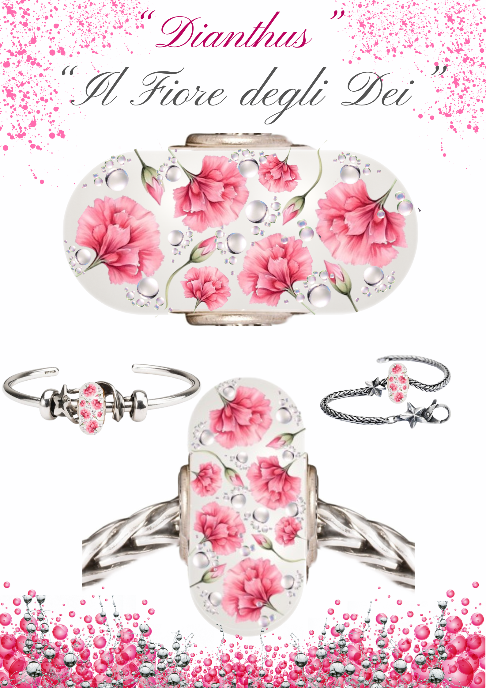 “Dianthus” è un bead intrigante, affascinante e magico. Presenta dei motivi floreali : preziosi fiori e boccioli di garofano rosa danzano nel vento in un giardino scintillante baciato dalla rugiada del mattino