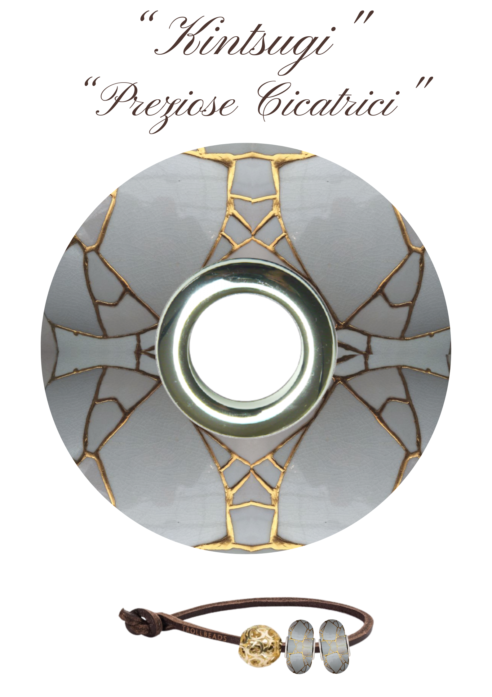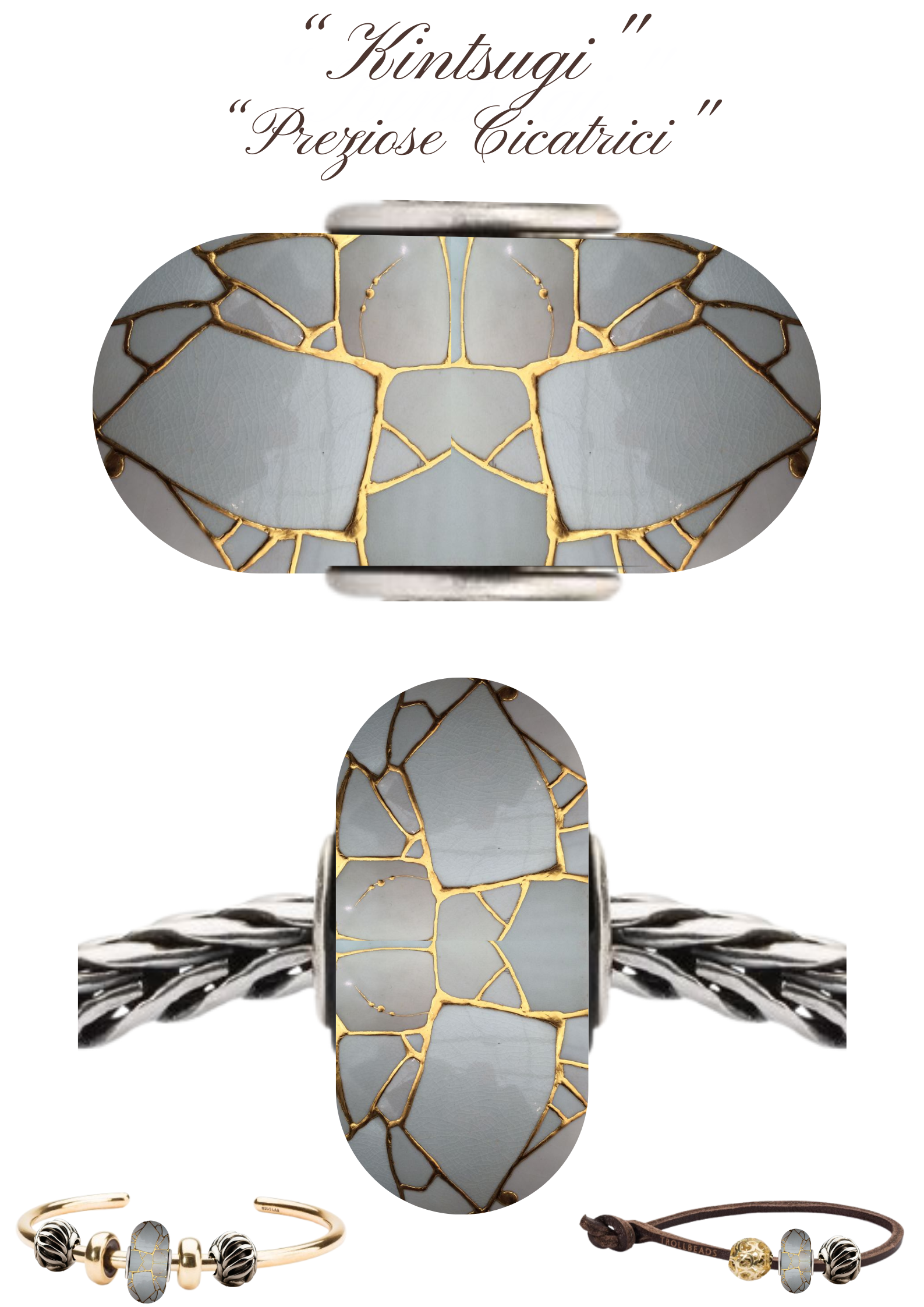 Questo beads è ispirato all’antica arte giapponese del Kintsugi, una forma d’arte che incanta non solo per le capacità tecniche necessarie per la sua esecuzione, ma anche per il pensiero filosofico, di vedere la bellezza nell'imperfezione, una delicata lezione simbolica, che ha stimolato,l’arte di abbracciare il danno, di non vergognarsi delle ferite. Quando una ciotola, una teiera o un vaso prezioso cadono frantumandosi in mille cocci, noi li buttiamo con rabbia e dispiacere. Eppure c’è un’alternativa, una pratica giapponese che fa l’esatto opposto: evidenzia le fratture, le impreziosisce e aggiunge valore all’oggetto rotto. Si chiama kintsugi , o kintsukuroi , letteralmente oro (“kin”) e riunire, riparare, ricongiunzione (“tsugi”).