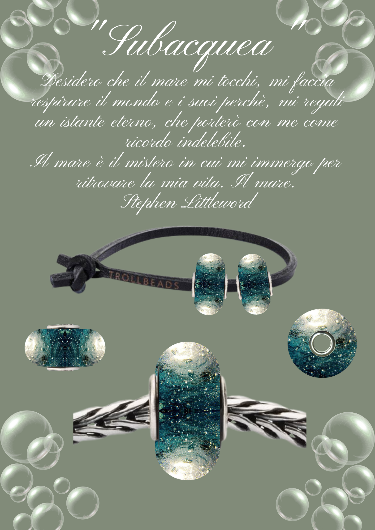 La libertà in un tuffo che puoi portare sempre con te..Fatti rapire dalla magia di questo bead tuffandoti nel meraviglioso mondo subacqueo, uno spettacolo affascinante tra mille bolle danzanti e scintillii di luce e inizia a sognare. Ti immergerai in un sogno meraviglioso restando incantato dal fascino delle profondità dei fondali. Cosa aspetti?Fai un respiro profondo e tuffati in un sogno straordinario, il mare è tutto da esplorare, non avere paura dell’ignoto, immergiti con tutto il tuo essere, galleggia nel mare dei pensieri,lasciando che scivolino via.Questo bead, oltre a ricordare la magnificenza del nostro pianeta acquatico e ad evocare un profondo senso di meraviglia e stupore, è un invito a superare tutte le sfide, un’opportunità di crescita e trasformazione personale al fine di sviluppare una forza e una comprensione più profonda di te stesso e del mondo che ti circonda.