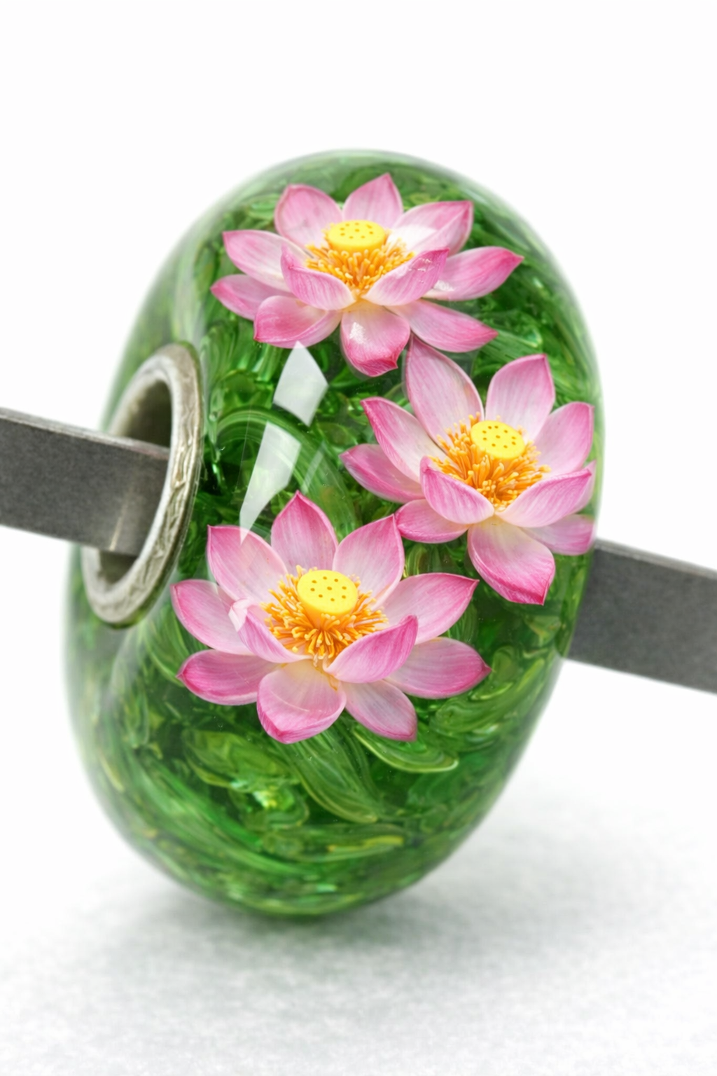 Cette perle en verre révèle un fond vert lumineux et translucide, évoquant la fraîcheur végétale et la profondeur de l’eau. Les nuances et mouvements internes captent la lumière, donnant à la matière une impression de vie et de fluidité.