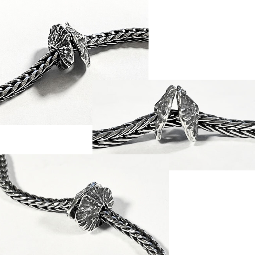 Two shells locked together at the top and bottom, half round so you can see the chain in between. Symbolizing the love that lock together, and the bond that goes between.