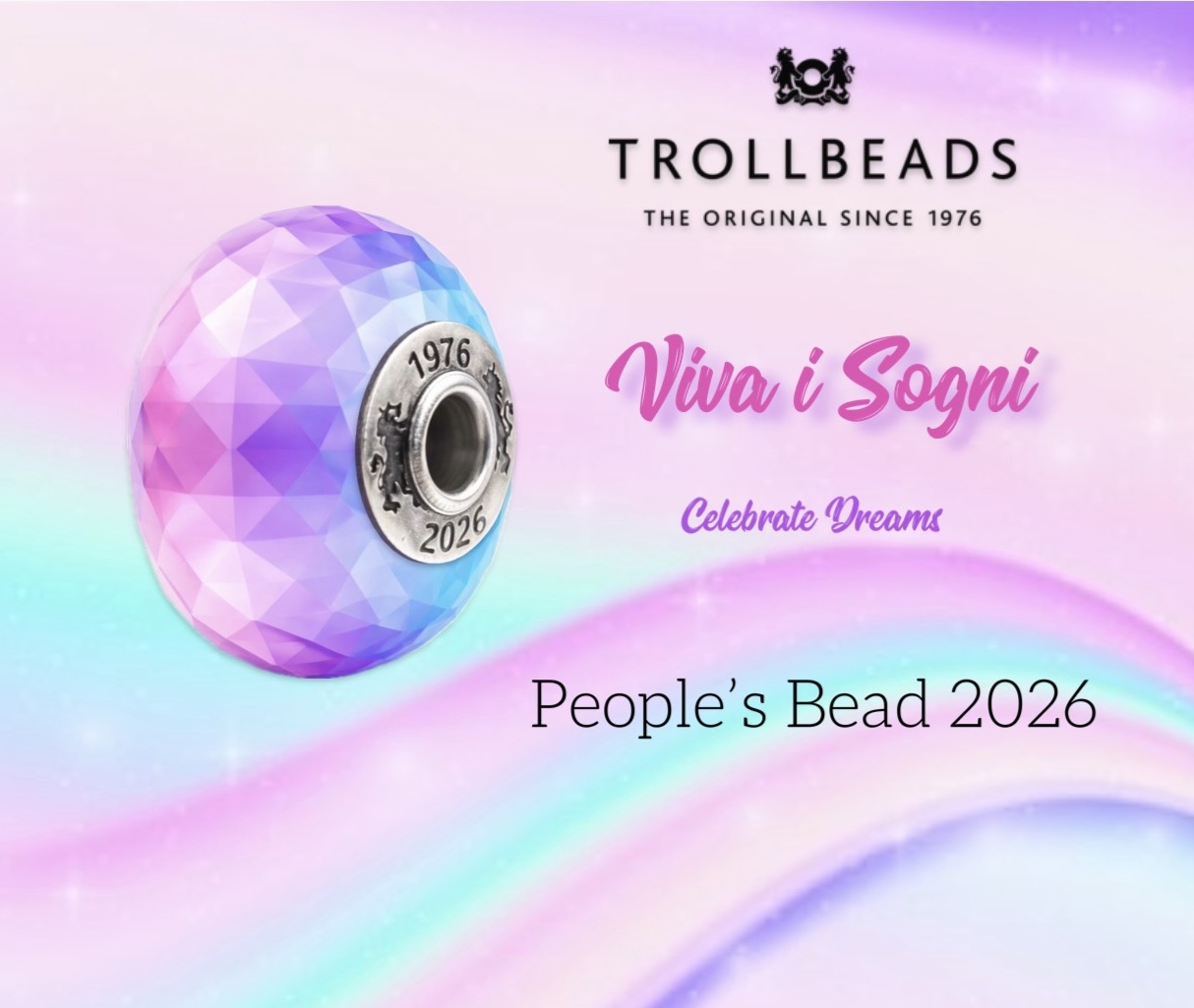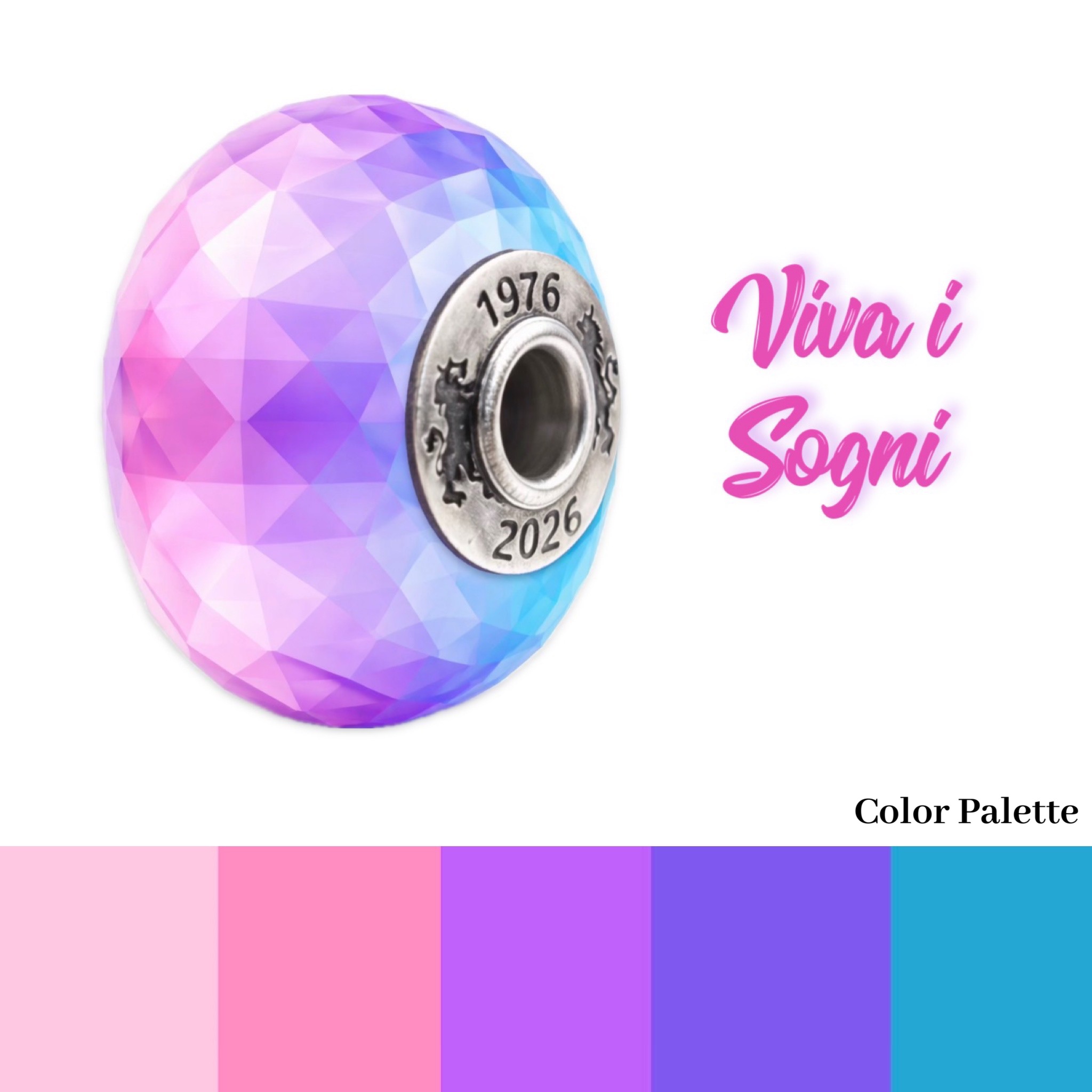 For the creation of this faceted glass bead, I drew inspiration from the dreamlike imagery that Trollbeads has been gifting us for 50 years. Fascinating worlds where everything becomes possible and magical. This glass piece was born as a celebration of its history, featuring a wide core engraved with the 50th-anniversary dates—just like the Celebrate Life bead in 2016. The idea is to redesign a rainbow and its colors exactly as we would visualize them in the ethereal world of dreams.