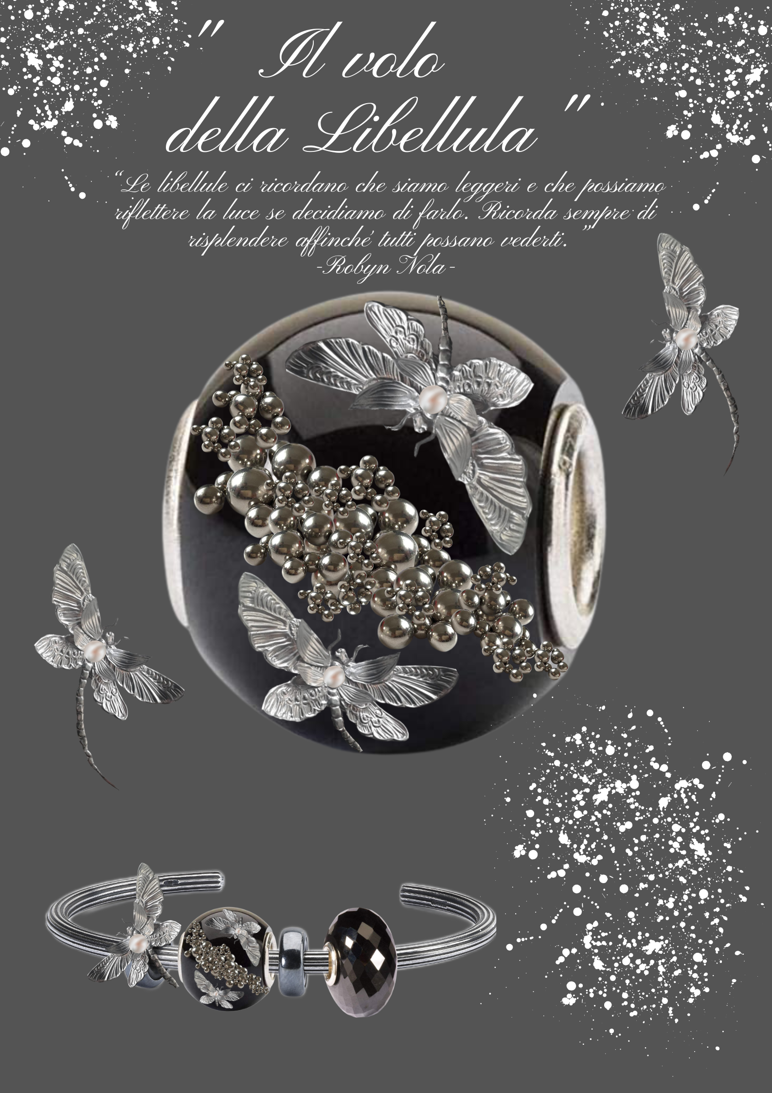 Questo bead rappresenta il volo di una libellula. La libellula è da sempre considerata un essere magico. Simbolo di libertà e messaggera di positività, essa rappresenta la trasformazione e la mutevolezza della vita. Essa si libra a mezz’aria. Il suo corpo è esile, ma attraversa ballando la tempesta