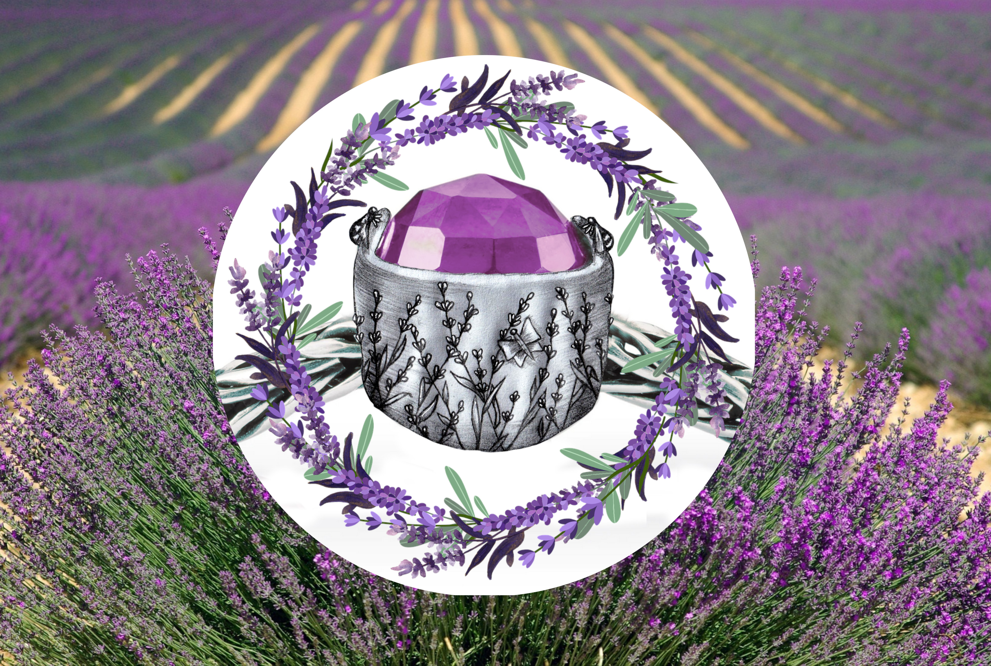 My designs shows lavender plants with a butterfly and two bees holding the facetted amethyst.
