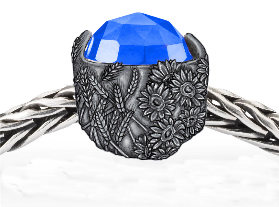 Nature is rich of treasures such as corn and sunflowers, feeding your body and also your soul with its beauty. My bead consists of a silver base with corn and sunflowers ans a blue stone (lapislazuli or agate) symbolizing the bright blue sky.