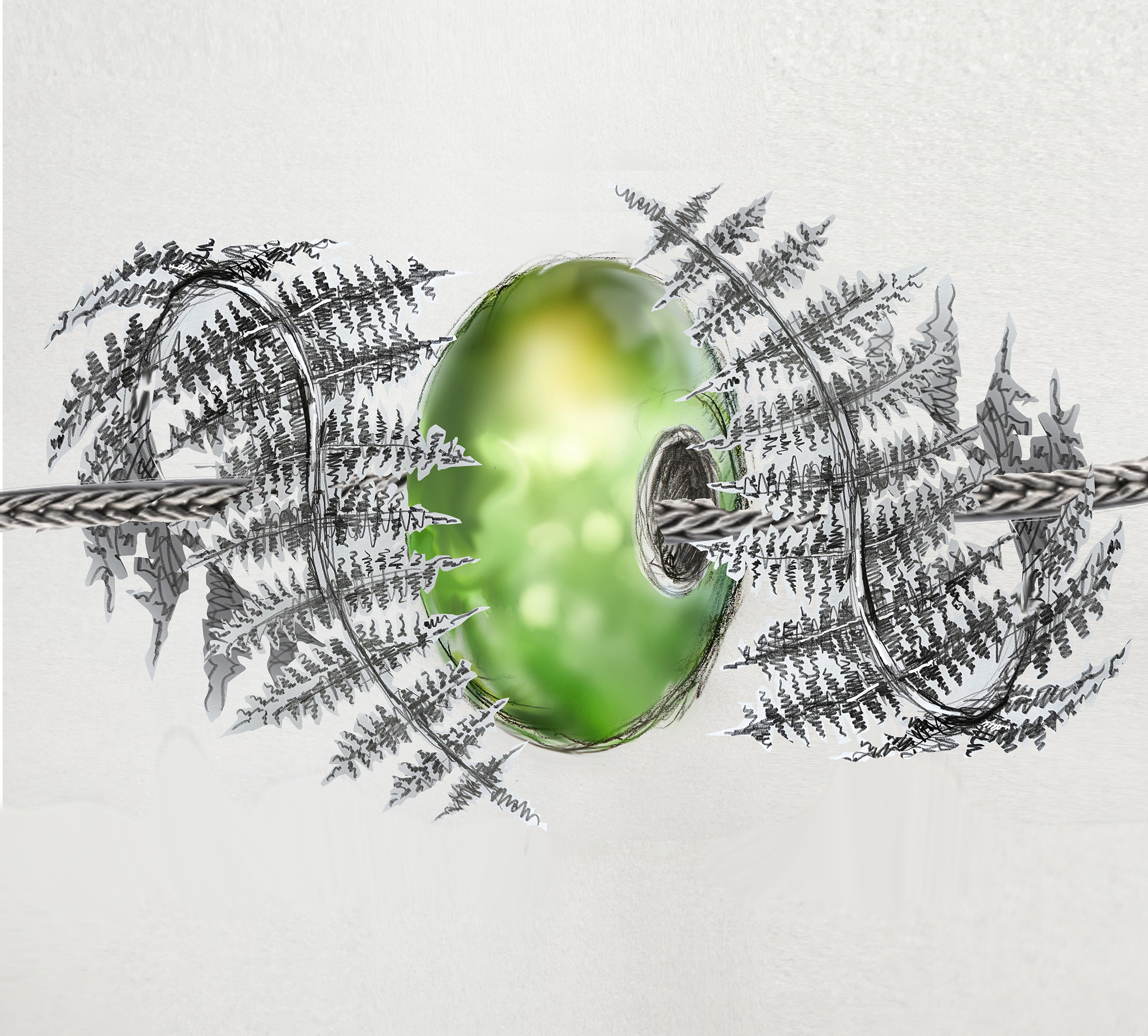 A mysterious intertwining fern wraps around the bracelet and the beads surrounding it.