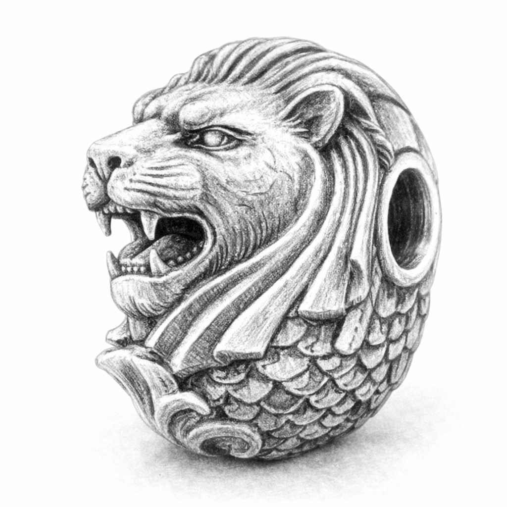 Inspired by Singapore’s Merlion, this bead represents strength rising from the sea and the meeting of cultures through trade and travel. The lion symbolises courage and leadership, while the flowing scaled body reflects the ocean and Singapore’s maritime heritage. Crafted in gold and silver, the bead celebrates harmony between power and fluidity, tradition and modern design.