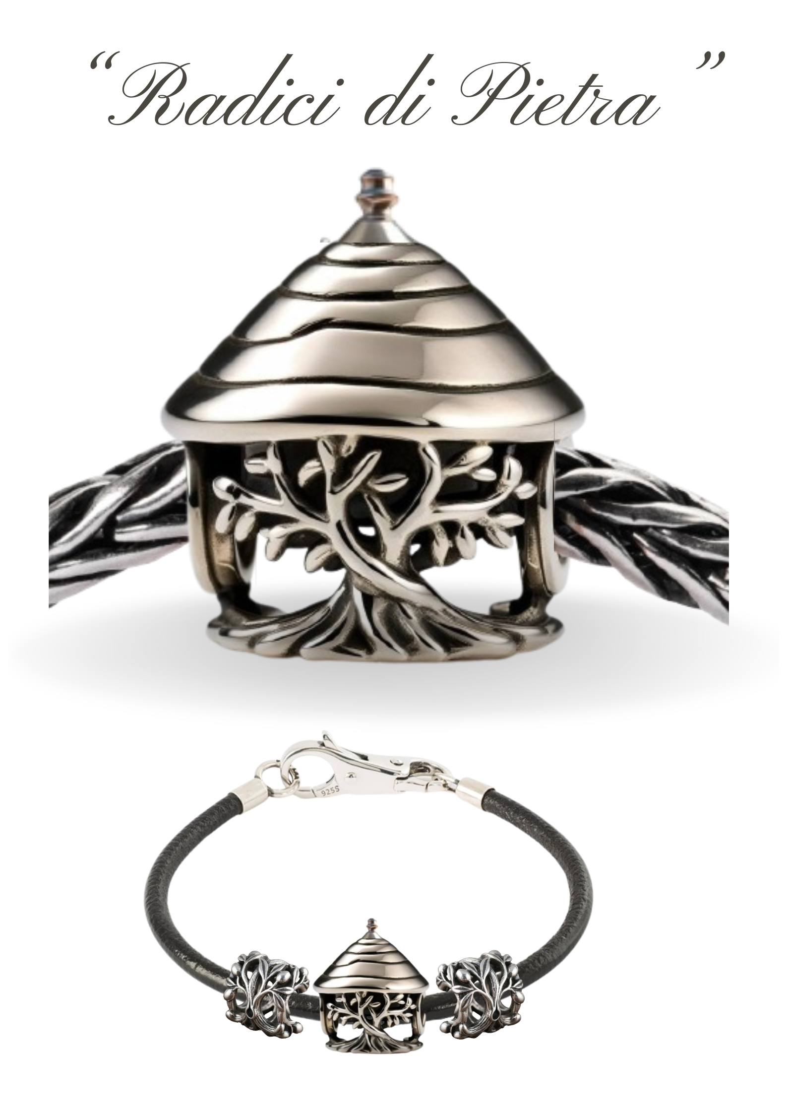 L'ulivo è simbolo di pace, forza e capacità di rigenerarsi. Il trullo, con la sua tecnica di costruzione "a secco", è un esempio di adattamento sostenibile all'ambiente. L'unione crea un'opera che parla di resilienza – la capacità di resistere al tempo e alle difficoltà – e di un equilibrio armonico tra l'opera umana e la natura.L'ulivo secolare è un "gigante della natura" testimone della storia. Il trullo ha un fascino mistico ed esoterico. "Radici di Pietra" evoca l'eternità, il passare del tempo che non scalfisce la bellezza, ma la rende più profonda e preziosa.Il gioiello in argento è un inno alla Puglia e al Mediterraneo, terra di trulli e ulivi. L'argento, con la sua lucentezza, richiama il colore pallido delle foglie di ulivo, mentre la lavorazione artigianale evoca la cura e la tradizione.